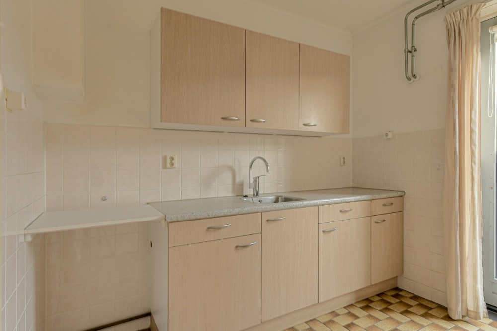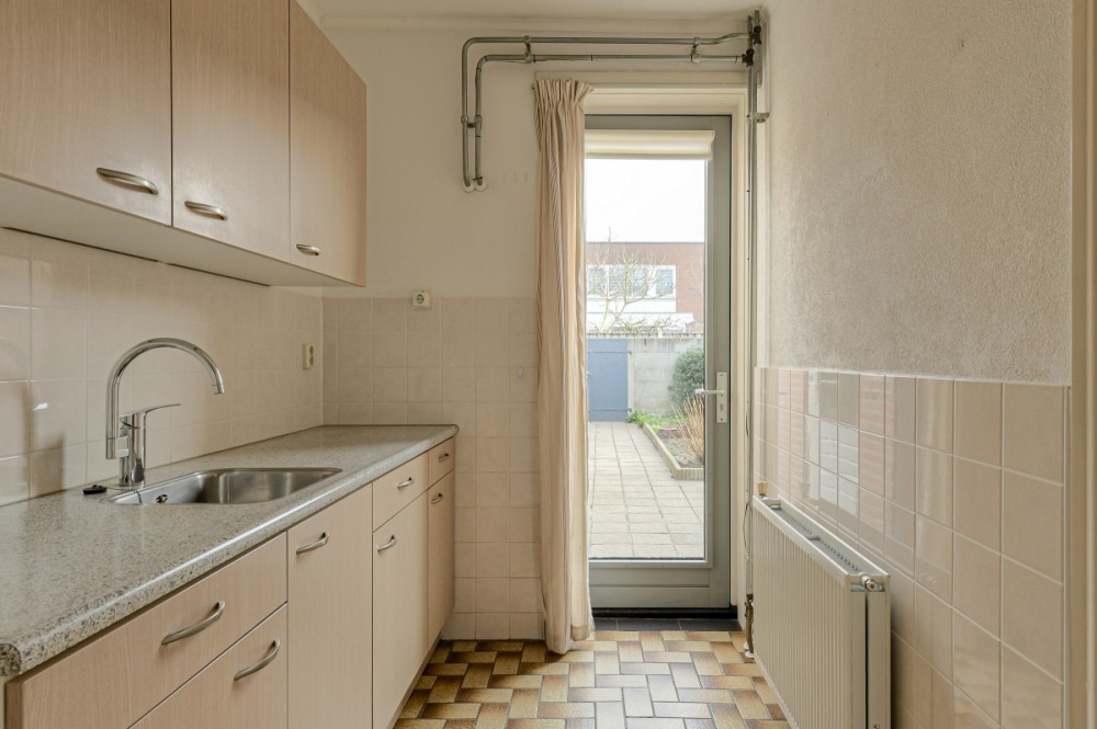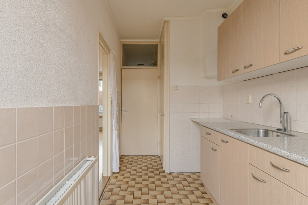 Besloten keukenruimte afm. ca. 6.70m² met tegelvloer en deur welkte toegang geeft tot de achtertuin. Het keukenblok is in een rechte opstelling geplaatst en beschikt over een spoelbak en diverse boven- en onderkastjes.