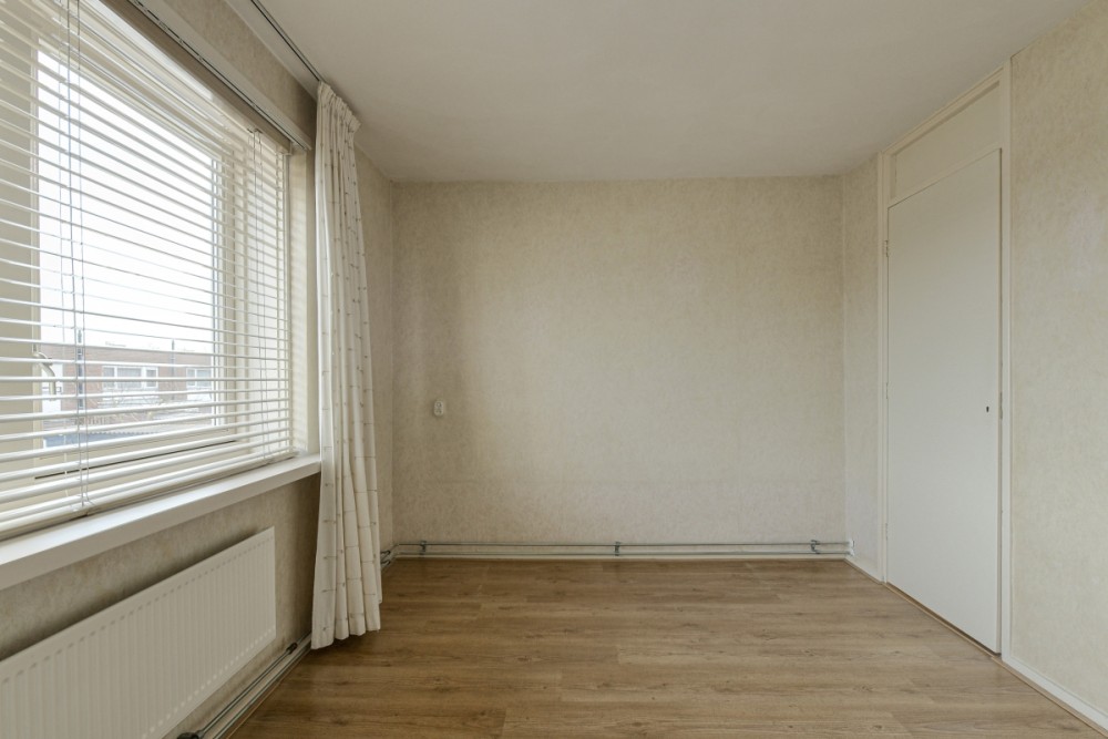 Slaapkamer 1: ca. 9.9 m² met laminaatvloer, vaste kast en grote raampartij.