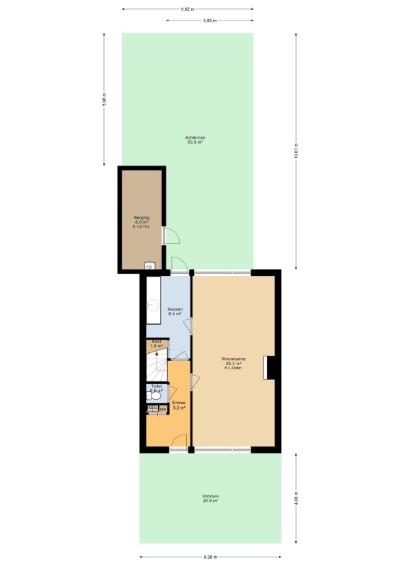 Diepe keurig onderhouden voor en achtertuin. De achtertuin welke is gelegen op het zuid/ oosten. beschikt over borders met beplanting en een berging welke is voorzien van elektra en hier bevindt zich de opstelplaats van de cv-ketel.