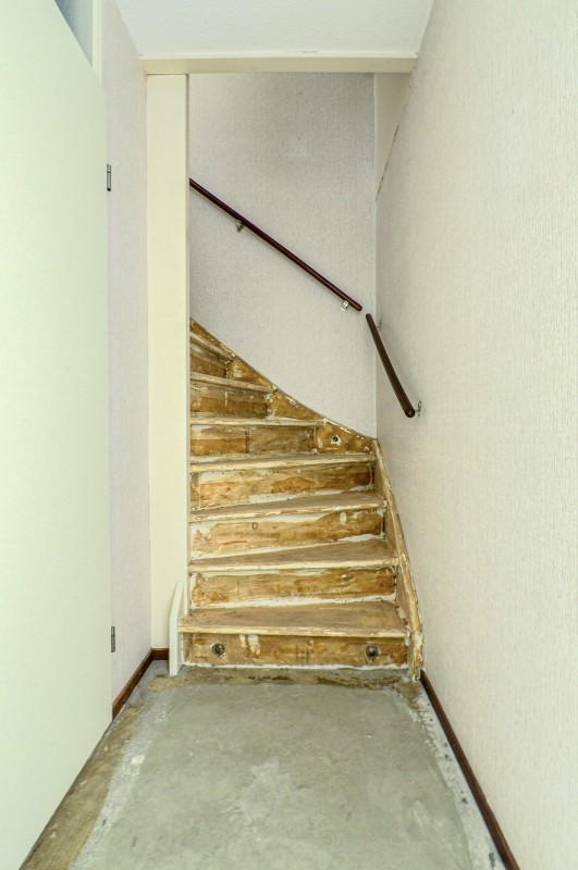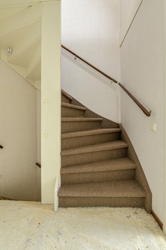 Overloop welke toegang geeft tot de twee slaapkamers, alsmede de badkamer en vaste trapopgang naar de tweede verdieping.