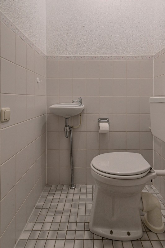 Via een tussenportaal komt u bij het gedeeltelijk betegeld toilet met fontein en vanuit daar heeft u de trapopgang naar de eerste verdieping.