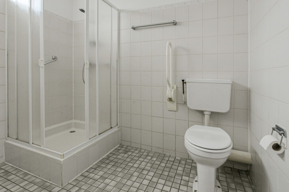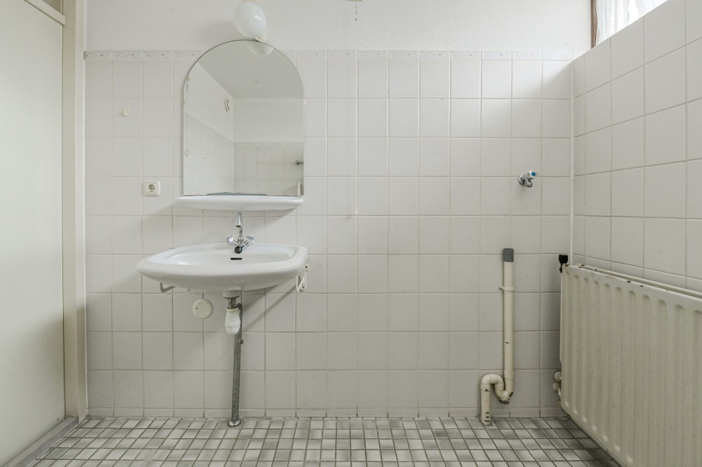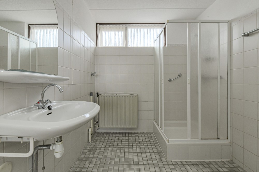 De eenvoudige badkamer afmeting circa 2.43 x 2.19 m. beschikt over een douche, vaste wastafel, toilet en aansluiting ten behoeve van de wasautomaat.