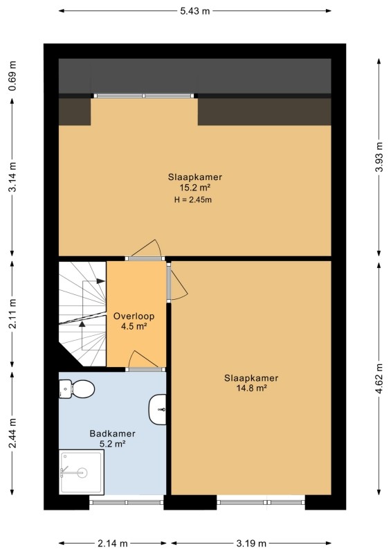 Slaapkamer achterzijde afmeting circa 3.14 x 5.42 m. met dakkapel.
