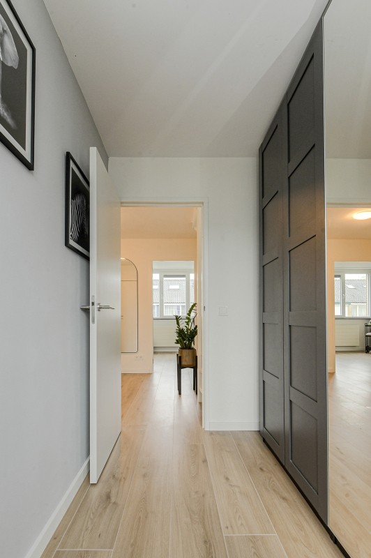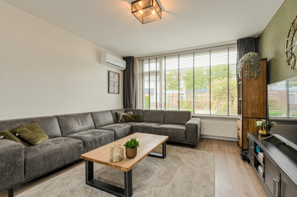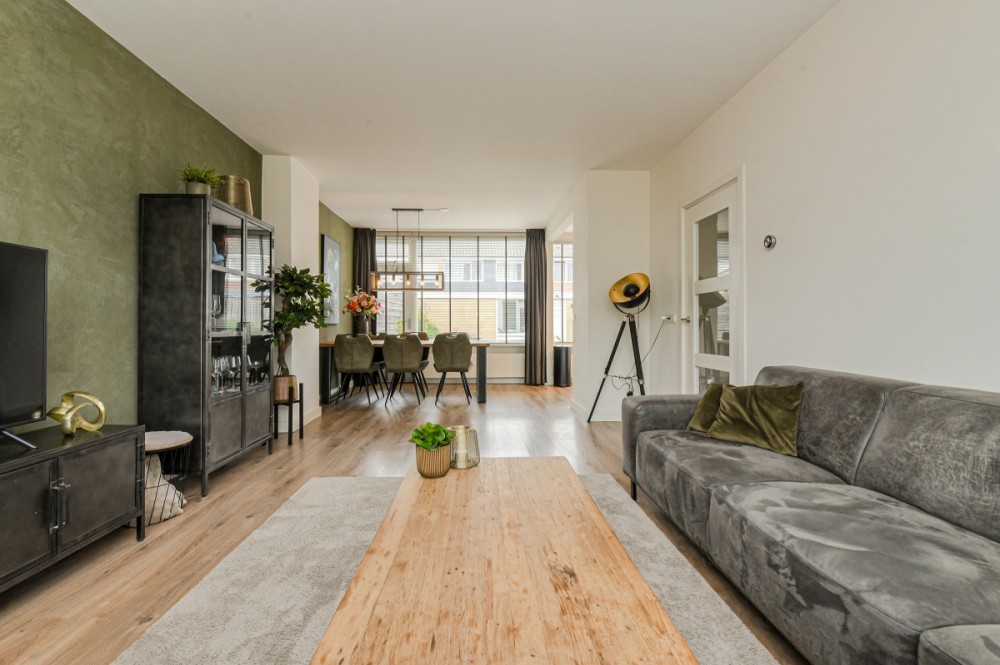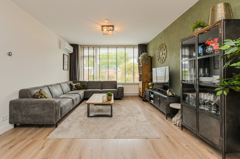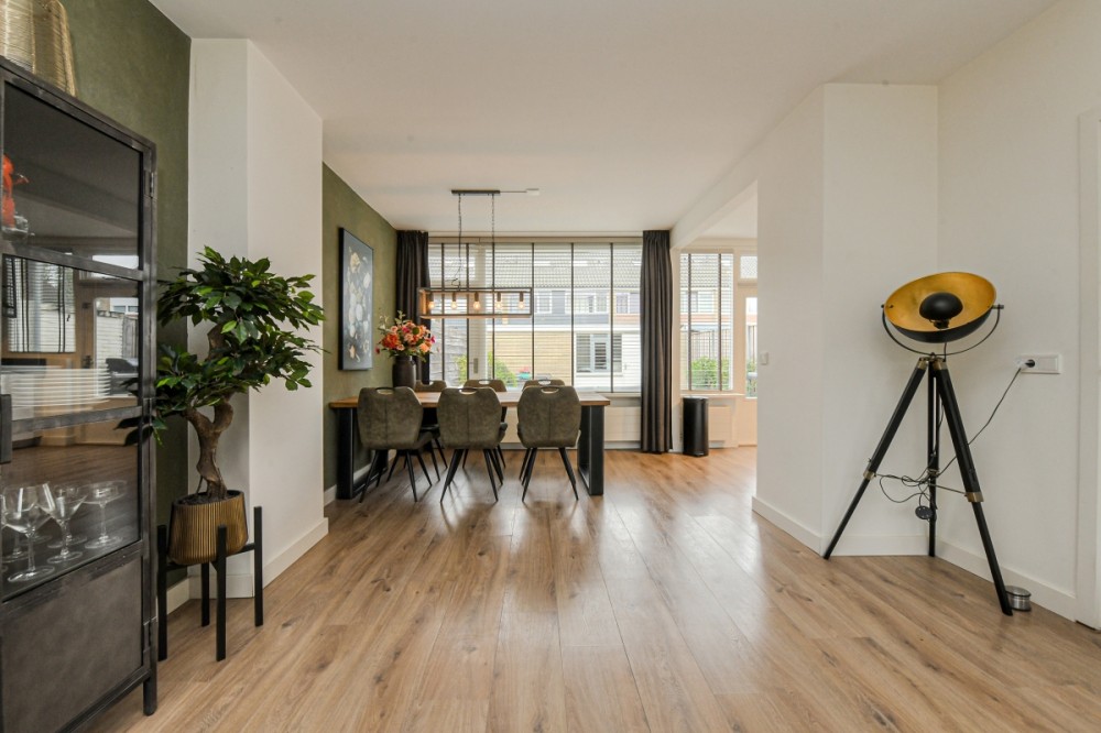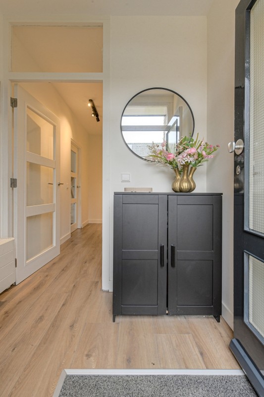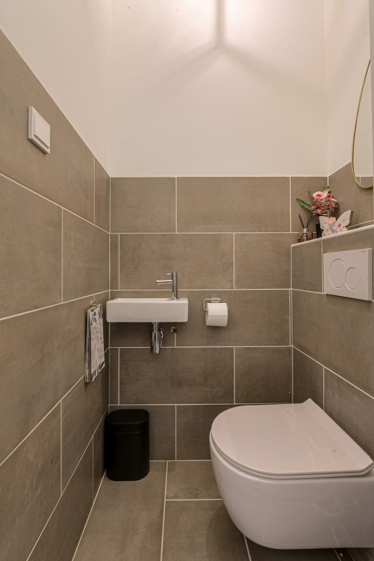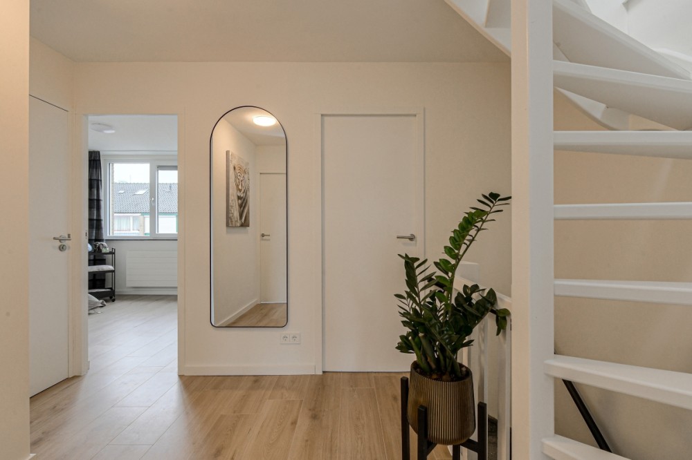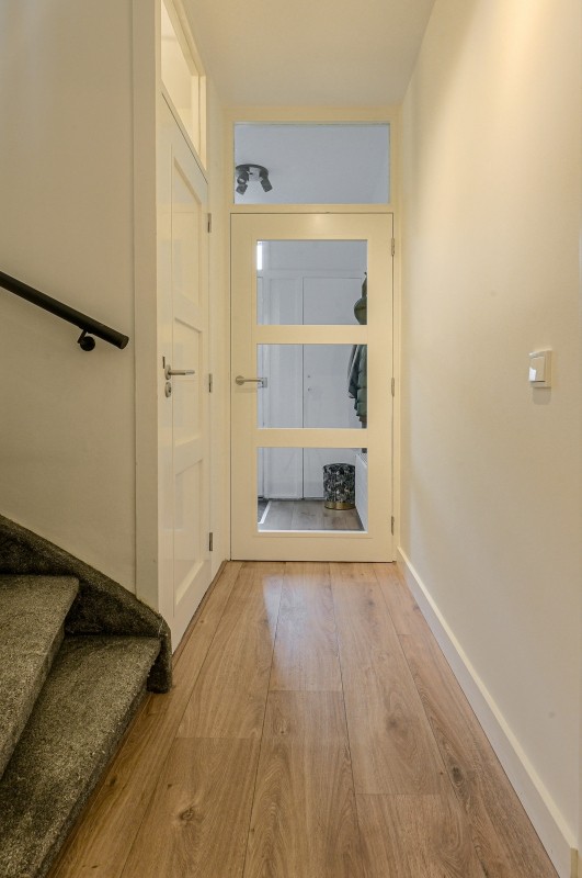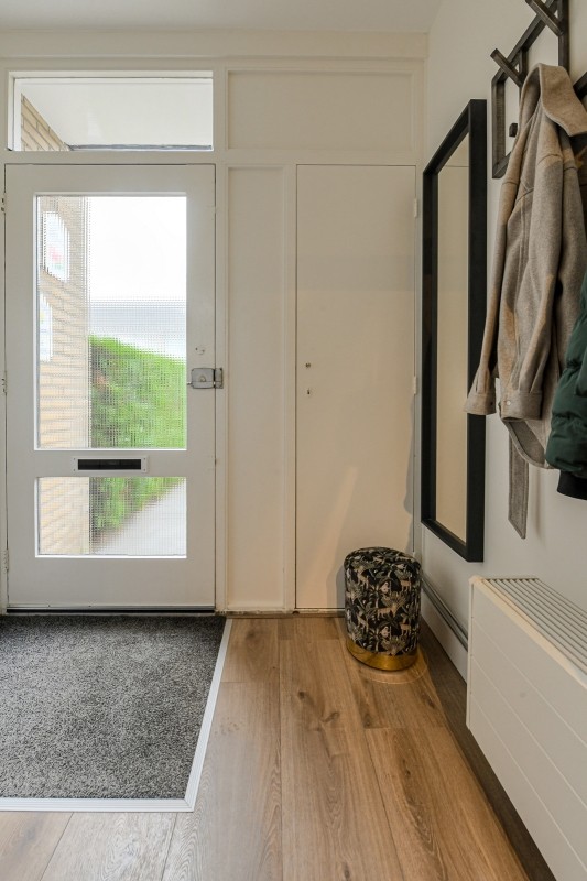 Entree/ hal, garderobenis, meterkast en moderne toiletruimte v.v. hangcloset en fonteintje. Vanuit de hal bereik je de ruime woonkamer, die recent volledig is vernieuwd en voorzien is van een stijlvolle laminaatvloer en strak stucwerk. Aan de achterzijde zorgen grote raampartijen voor veel licht en uitzicht op de verzorgde tuin.