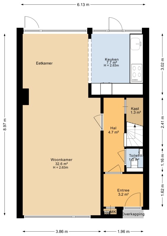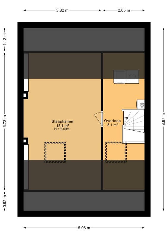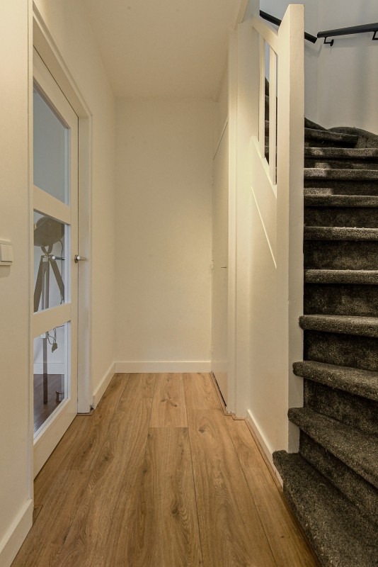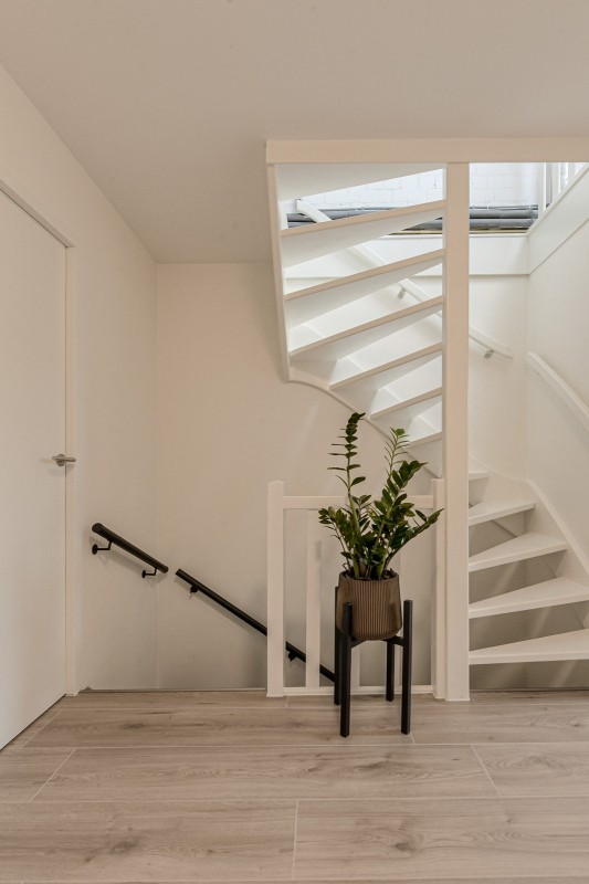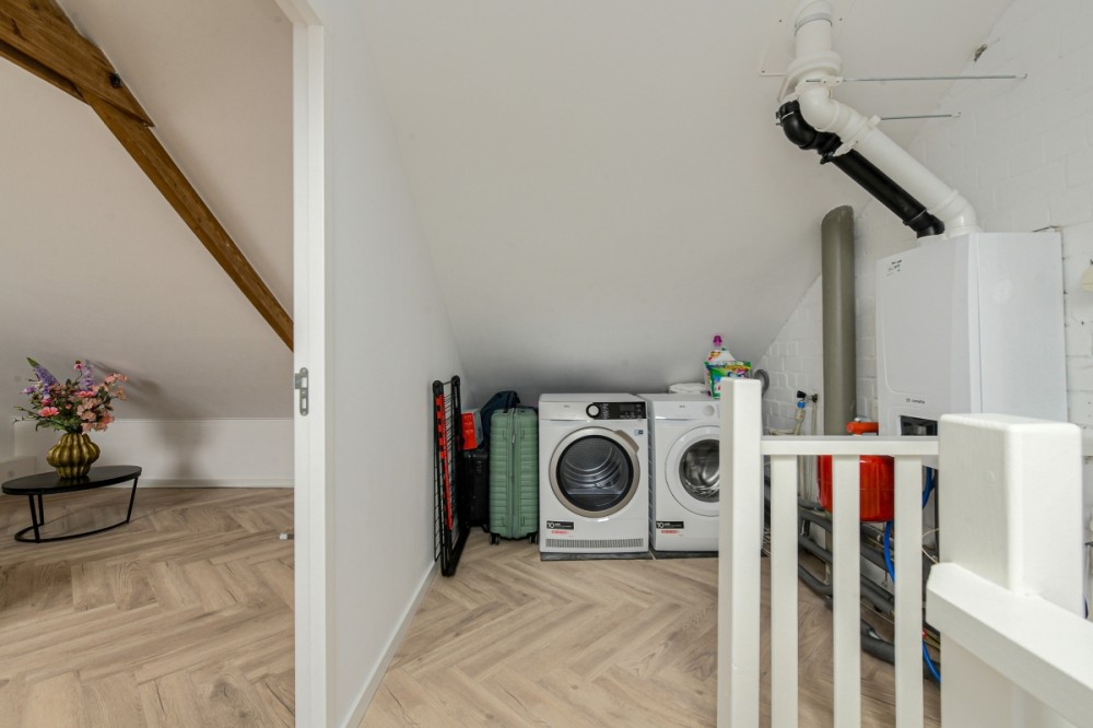 - Vaste trap naar de tweede verdieping met grote kamer, veel bergruimte en wasmachine- en drogeraansluiting.