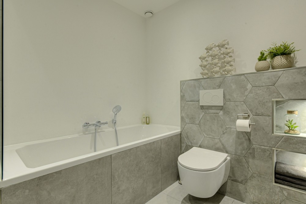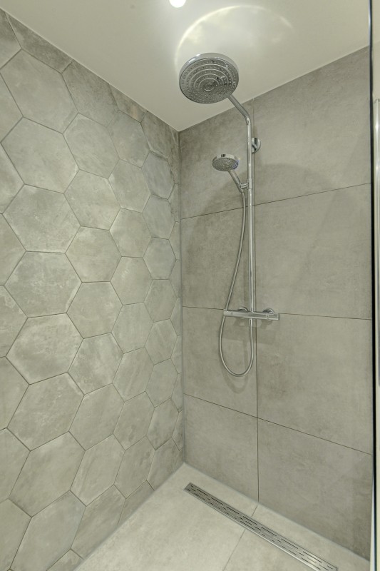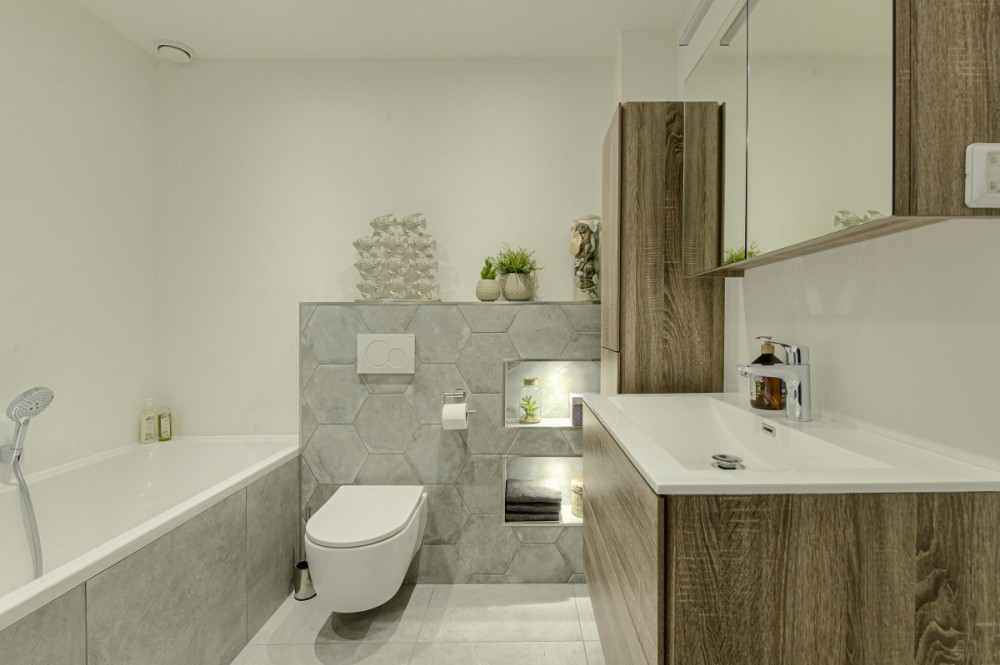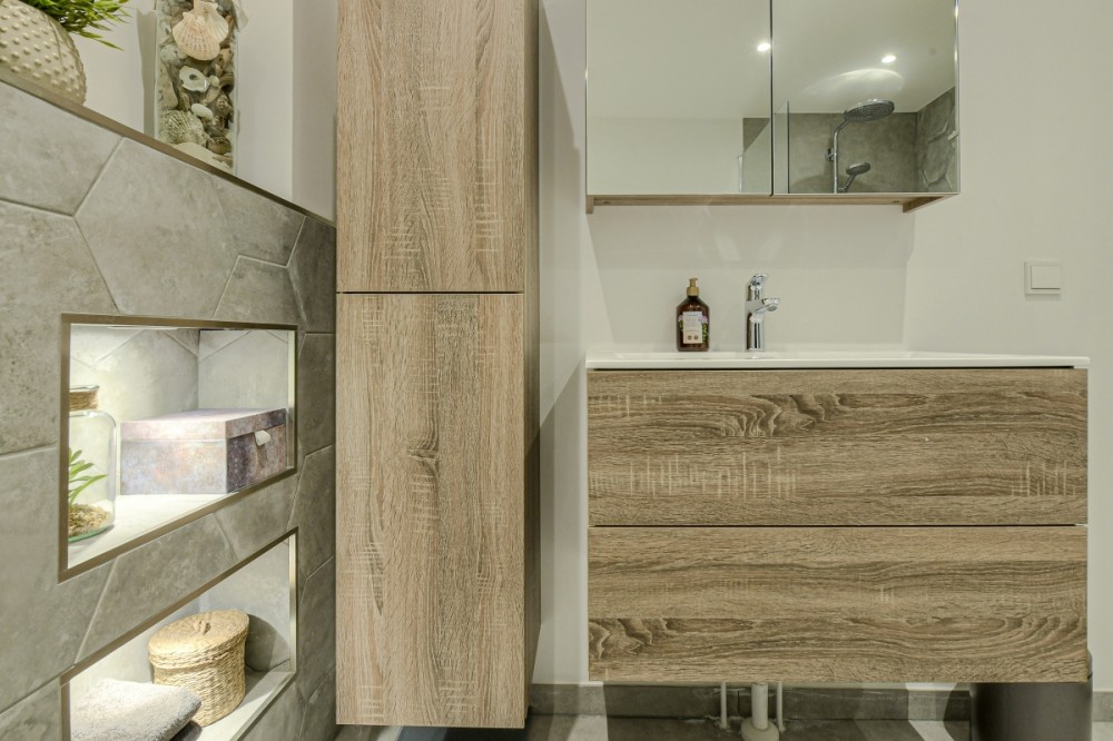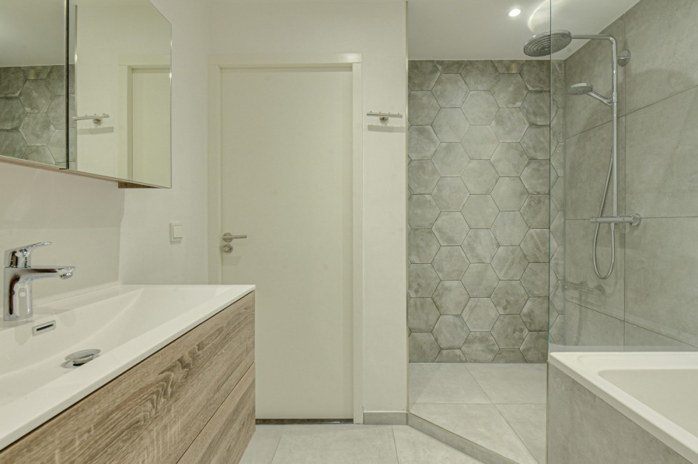De praktisch ingedeelde badkamer is recent volledig gemoderniseerd en beschikt over een ligbad, inloopdouche, wastafelmeubel en nistjes met inbouwspots.