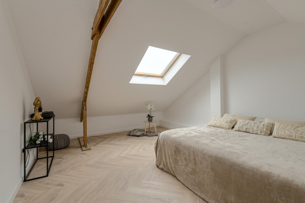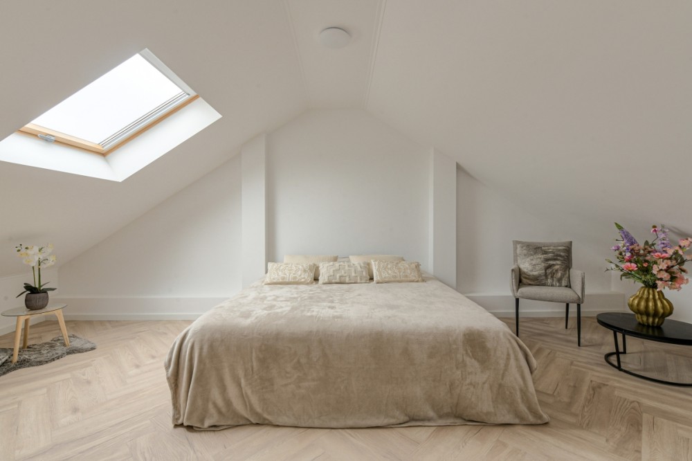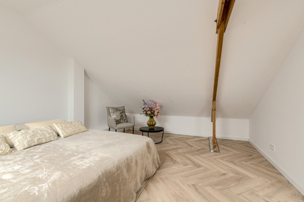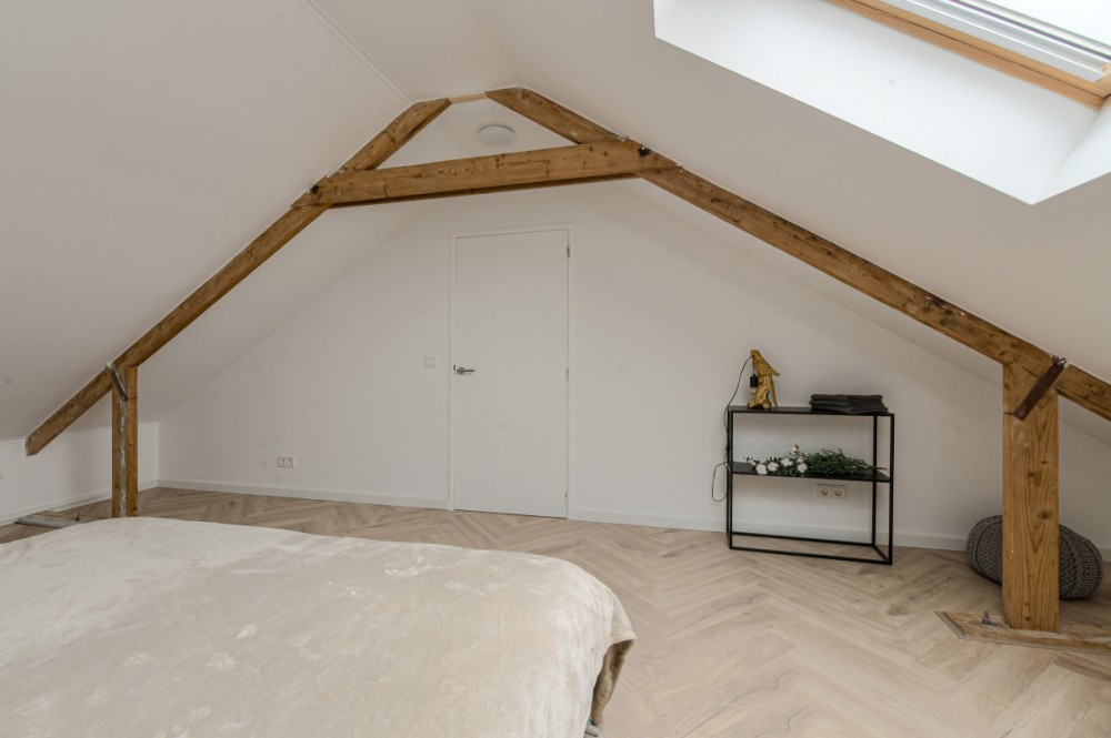 Via een vaste trap bereik je de tweede verdieping. Deze verdieping is keurig afgewerkt en voorzien van een 2 dakramen, aansluiting voor de wasmachine/droger, de cv-opstelling en extra bergruimte. De luxe houten afwerking maakt van deze verdieping een volwaardige vijfde slaapkamer.