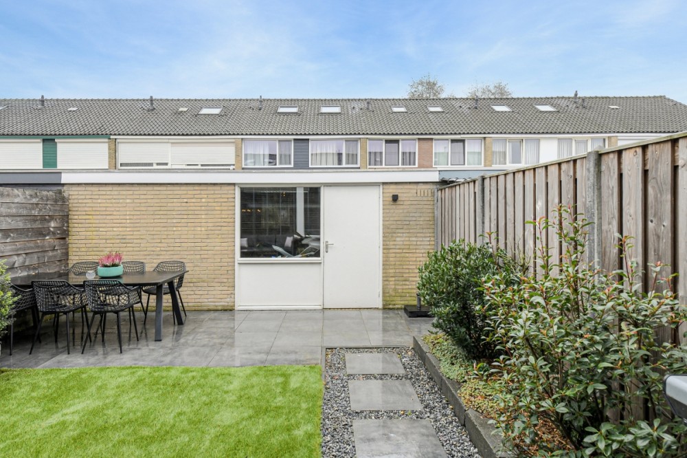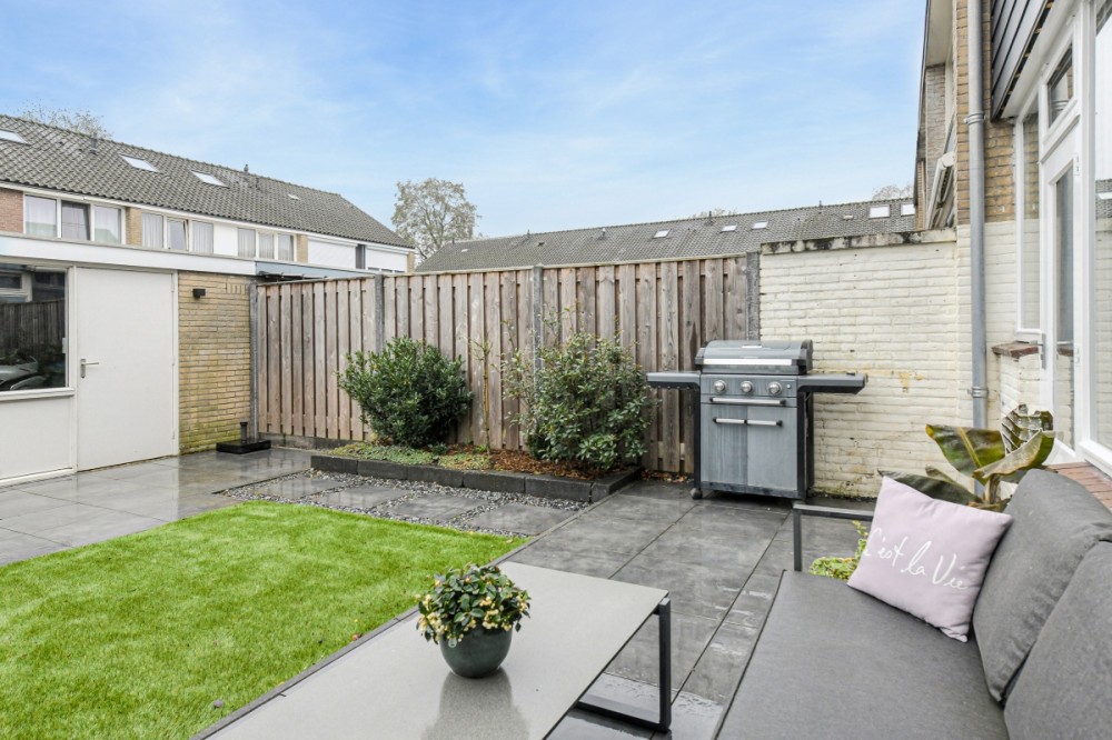 De voor- en achtertuin ligt op het zuid-oosten, is verzorgd aangelegd in 2018 en bestaat uit een combinatie van nette bestrating en kunstgras. Achterin bevindt zich een stenen berging met elektra en via de achterom is de woning ook vanaf de achterzijde bereikbaar.