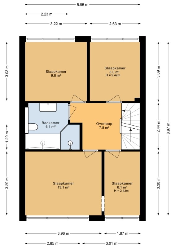 De overloop geeft toegang tot vier slaapkamers en de badkamer.