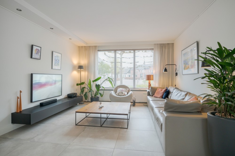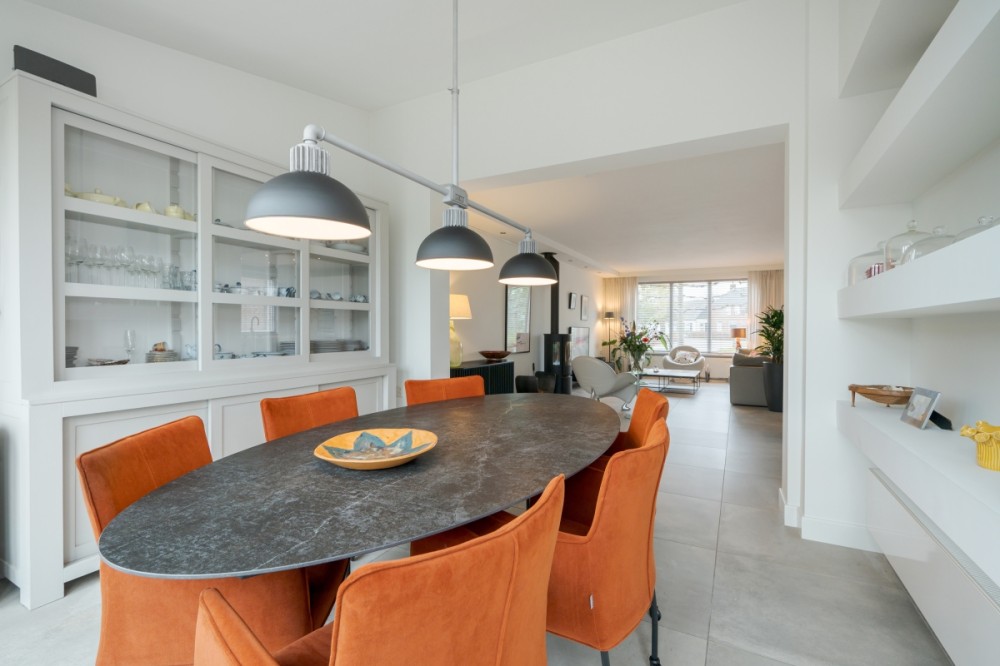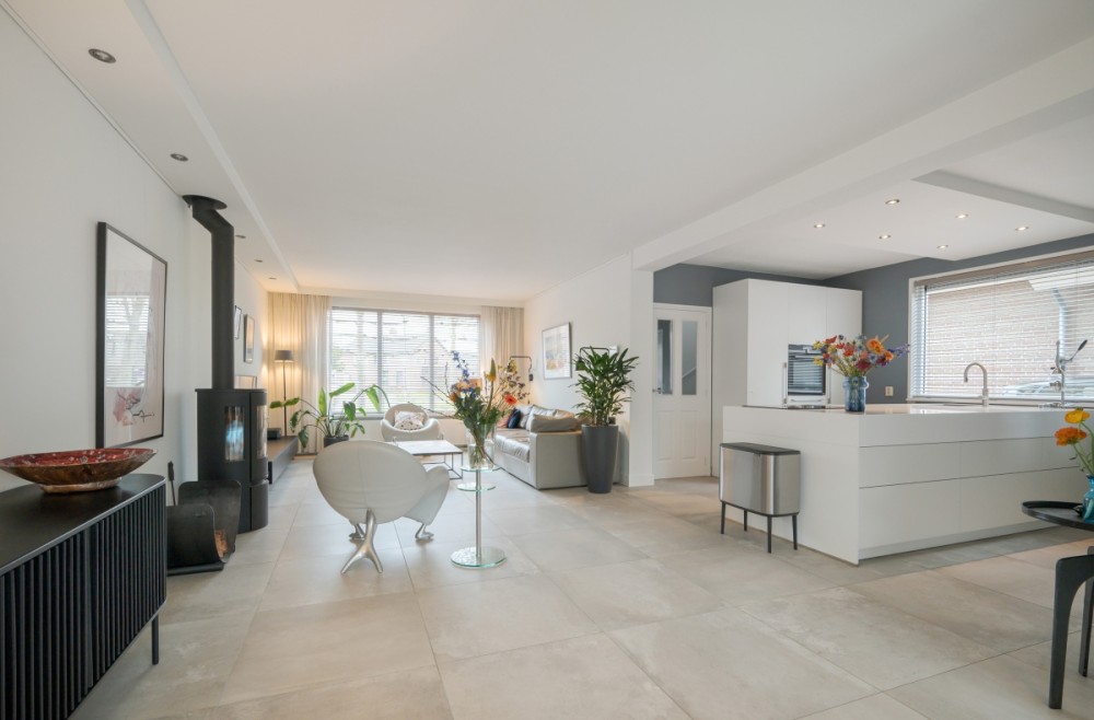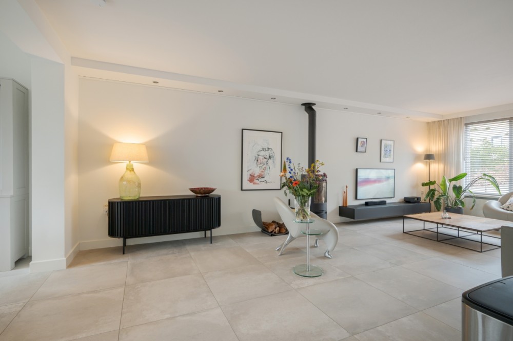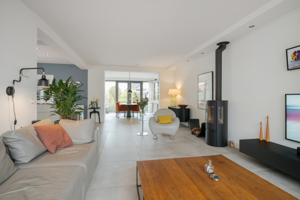Riante living met eveneens een plavuizen vloer, strak gestucte wanden en plafond. Voorts de gezelligheid van de hout gestookte kachel. Het plafond is voorzien van inbouwspots. In de aanbouw, waar thans de eettafel is gesitueerd, zijn er openslaande deuren naar de tuin.