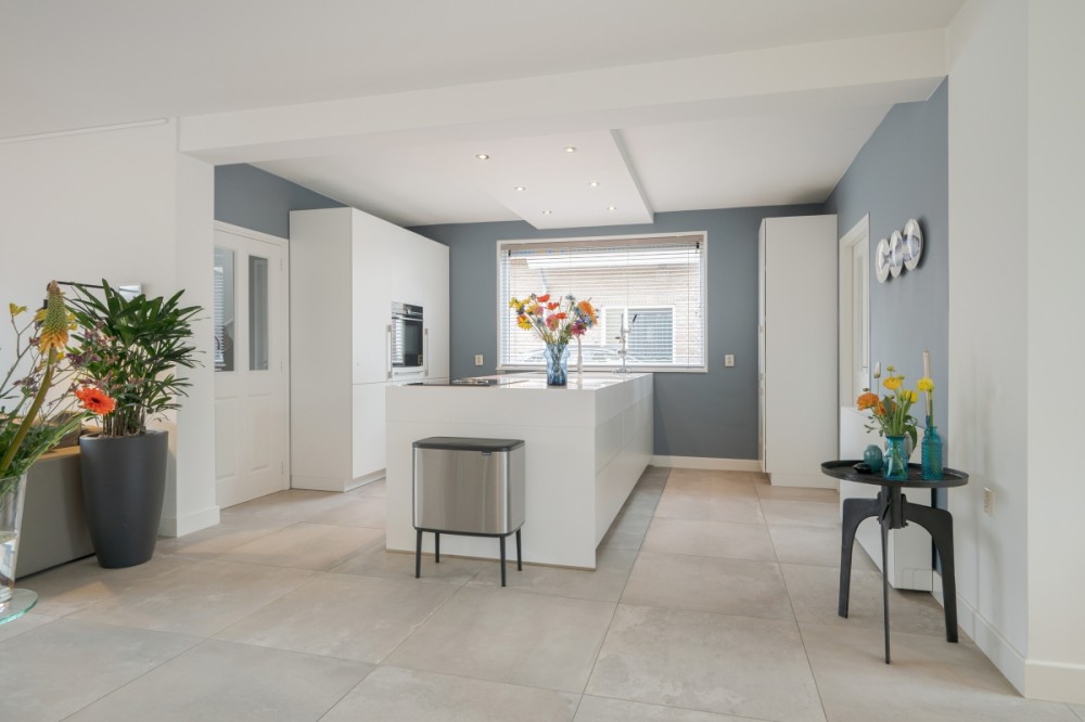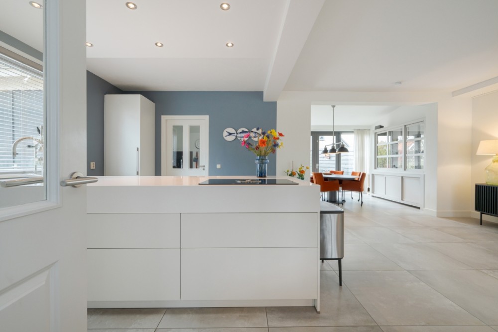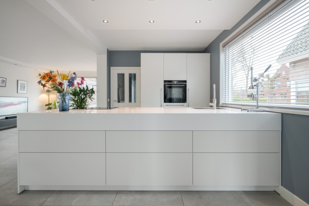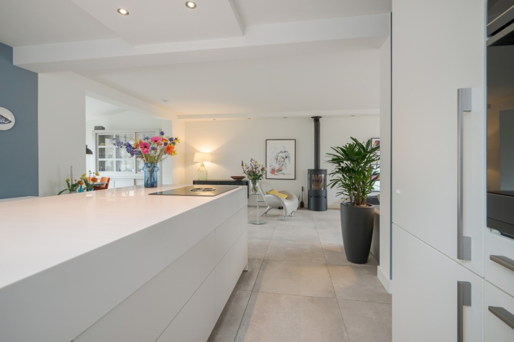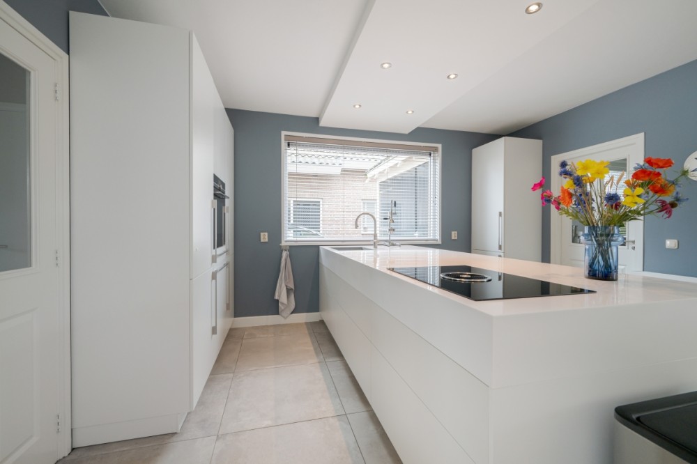 De keuken staat in open verbinding met de living, door de plaatsing van het fraaie kook/spoeleiland. Door de aanwezigheid van de kastenwand is er veel bergruimte aanwezig. Het kook/spoeleiland is voorzien van een Himacs aanrechtblad, gecombineerde keramische kookplaat met afzuiging (Bora), vaatwasser en Quooker. Alle kasten en lades zijn soft close en greeploos. In de kastenwand treft u nog de volgende apparaten aan, te weten; koelkast, diepvries, Siemens stoom/combi oven/magnetron.