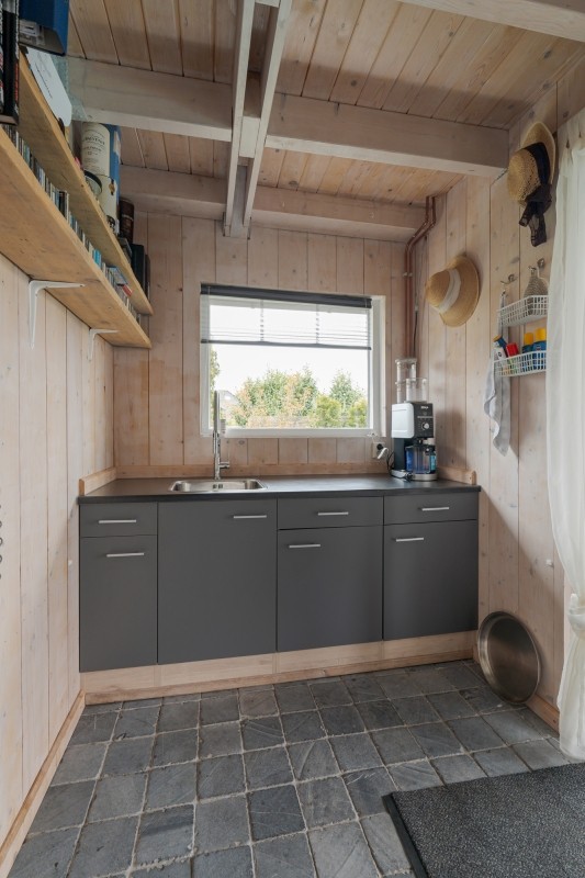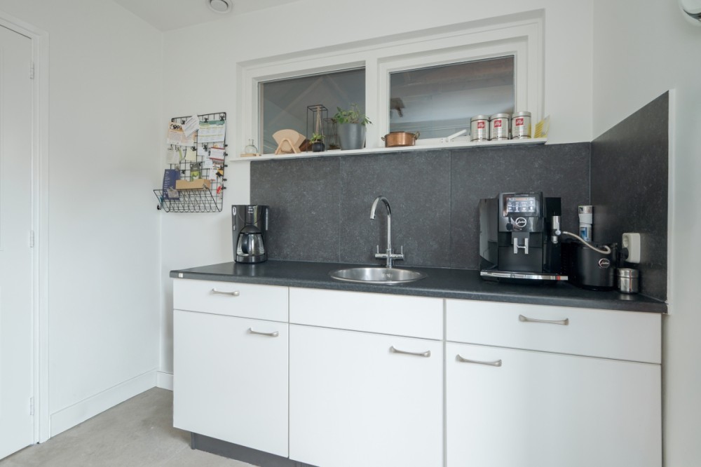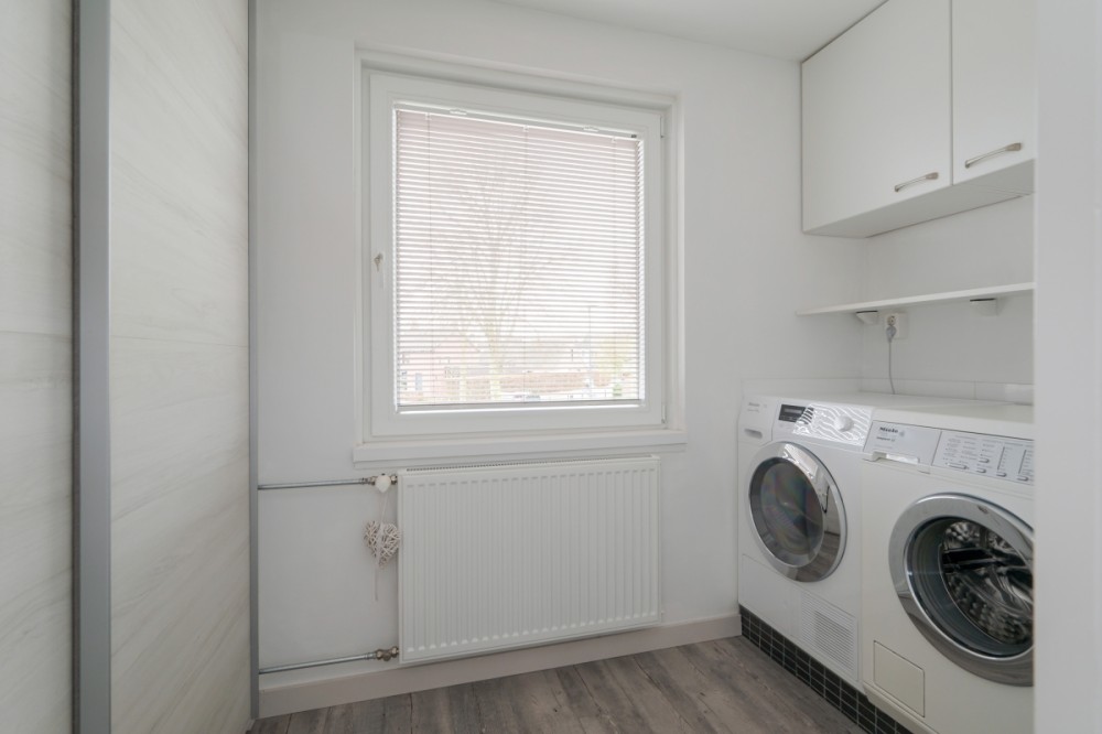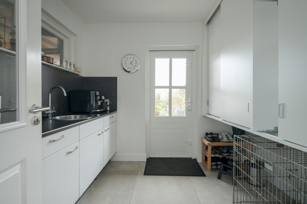 Vanuit de keuken heeft u doorloop naar de bijkeuken, afmeting circa 7.7 m2, waar tevens een keukenblok is geïnstalleerd met boiler (2024) en kastenwand. Vanuit de bijkeuken is er toegang tot de tuin.