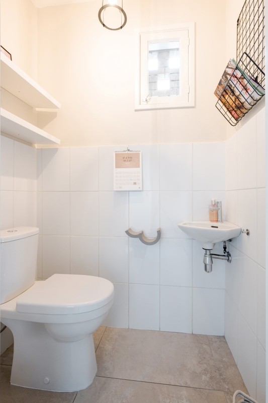Hal met plavuizen vloer, meterkast, betegeld toilet met fontein en kelderkast onder de trapopgang.