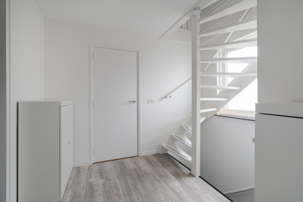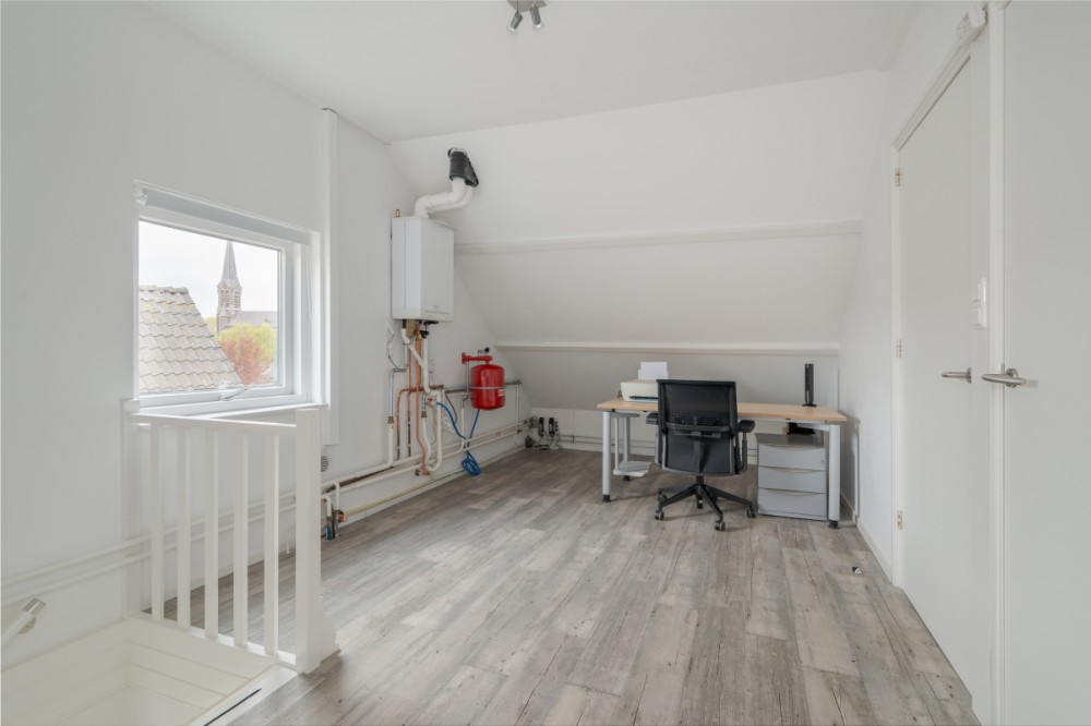 Middels vaste trap toegang tot de voorzolder waar de opstelplaats van de combiketel (bouwjaar 2022 Intergas) is gesitueerd. Tevens bergruimte aanwezig.