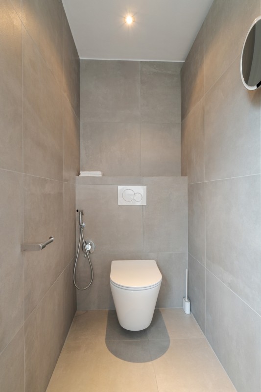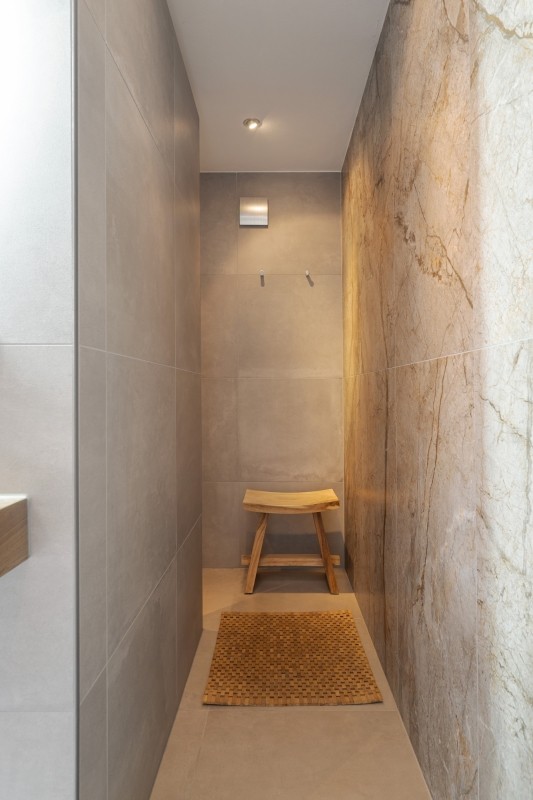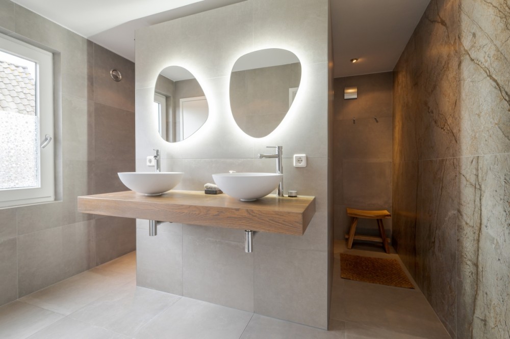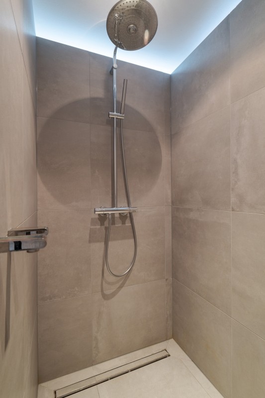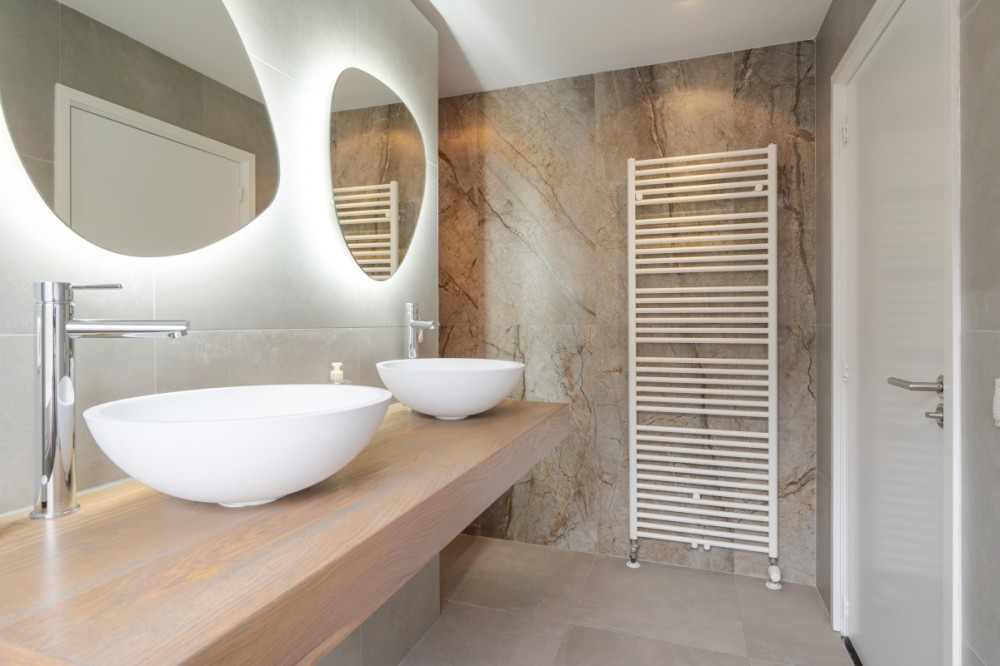 In 2022 gerenoveerde luxe badkamer, afmeting circa 3.29 x 2.97 m., met twee wastafelkommen op plateau, inloopdouche met stort- en handdouche, wandcloset, designradiator en inbouwkast. Een aparte ruimte voor wasmachine en droger met een schuifkastenwand.