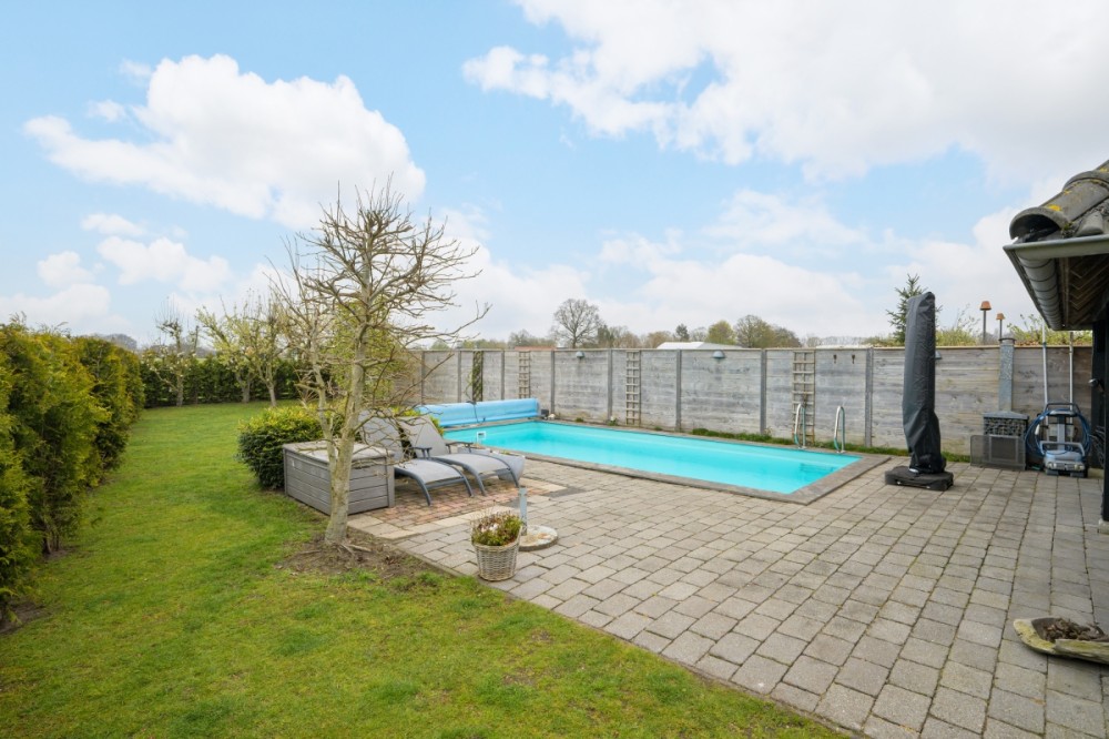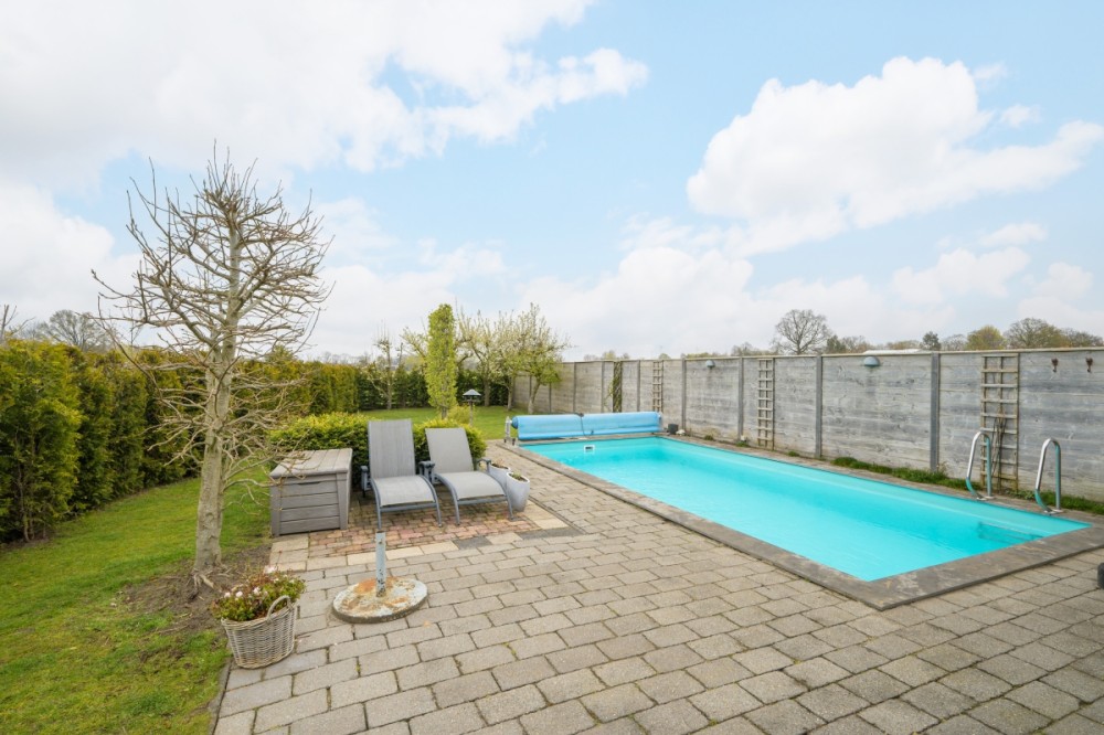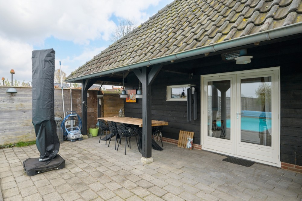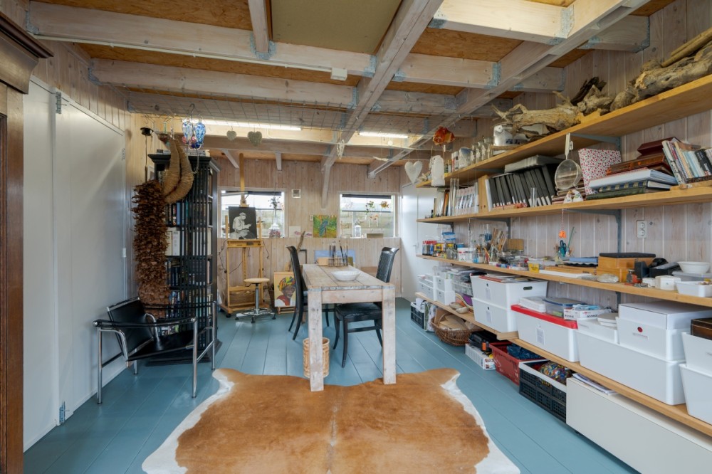 Nabij het zwembad is een bijgebouw/atelier gelegen met een afmeting van circa 7.60 x .640 m. De ruimte is in hout opgetrokken (dubbelwandig) met vlizotrap naar de bergzolder. Thans is de ruimte onderverdeeld in atelierruimte, bar en schuur. In het bar gedeelte is een keukenblok (2024) waarbij de afvoer voorzien is van een sanibroyeur. Voorts is er in de schuur een toilet. Vanuit de bar zijn er openslaande deuren naar het terras. Het terras sluit naadloos aan bij het terras van het zwembad. Het verwarmde zwembad heeft een afmeting van circa 7.00 x 3.50 m. welke afsluitbaar is met een zomer- en een winterdoek. Ten behoeve van de verwarming van het zwembad is een warmtepomp gesitueerd in de tuin.