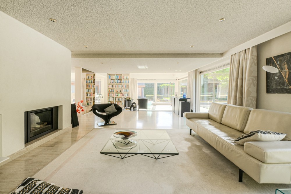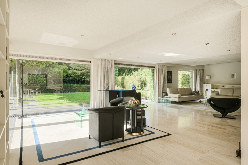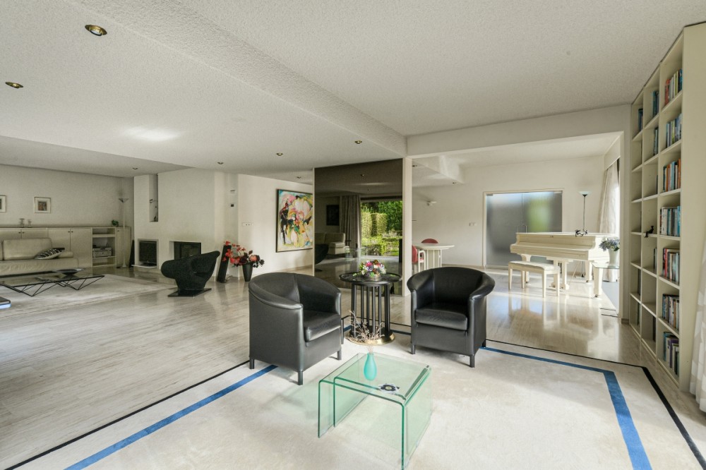 De ruime, lichte living (ca. 100m²) is bereikbaar middels dubbele glazen deuren en is o.a. voorzien van een travertin tegelvloer v.v. vloerverwarming, gashaard en onderverdeeld in een zitgedeelte en een eetgedeelte. De ruimte is strak afgewerkt met gladde wanden en spuitwerk plafonds, heeft automatsiche zonwering en biedt een prachtig uitzicht op de groene tuin.Vanuit de woonkamer is er een directe toegang naar de keuken.