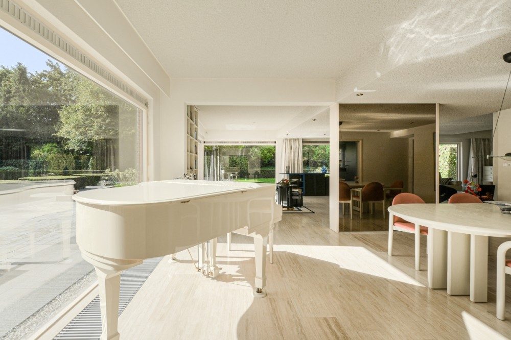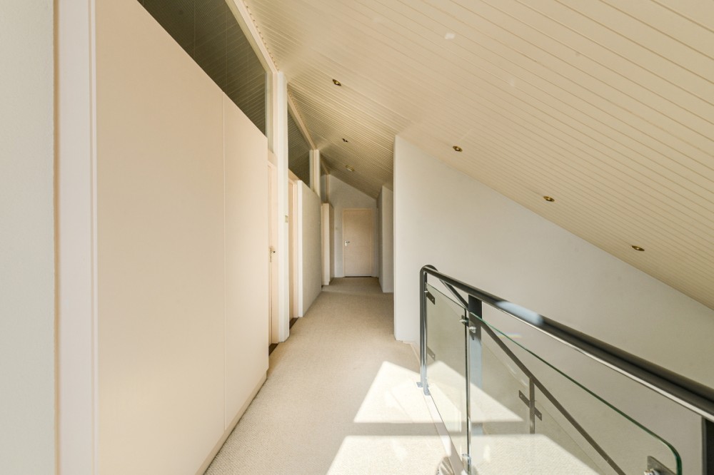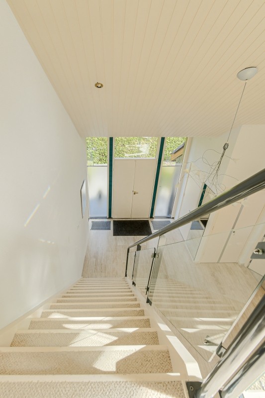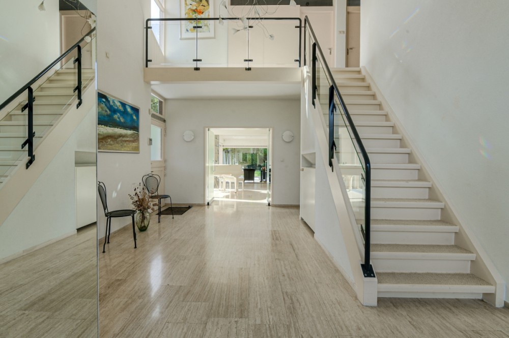 De royale, open ontvangsthal is afgewerkt met travertin tegelvloer en biedt toegang tot de garderobe, toiletruimte en prachtige trapopgang met strakke glazen balustrade. Vanuit deze hal toegang tot de werkkamer, de woonkamer en doorloop naar het terras.