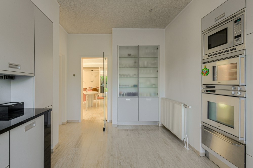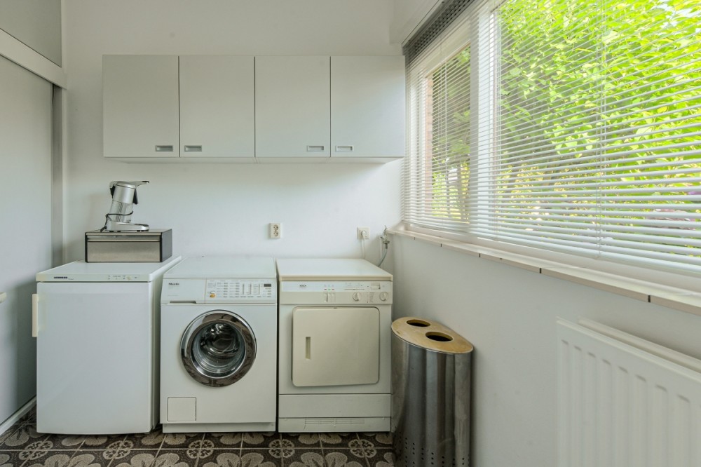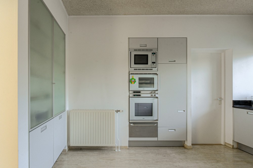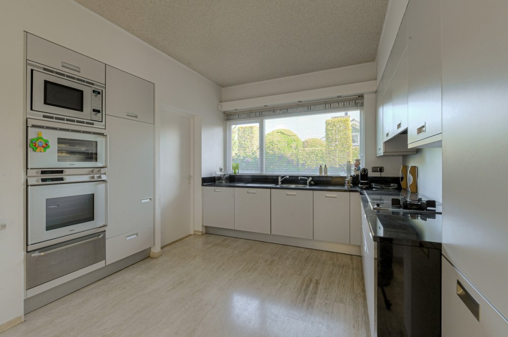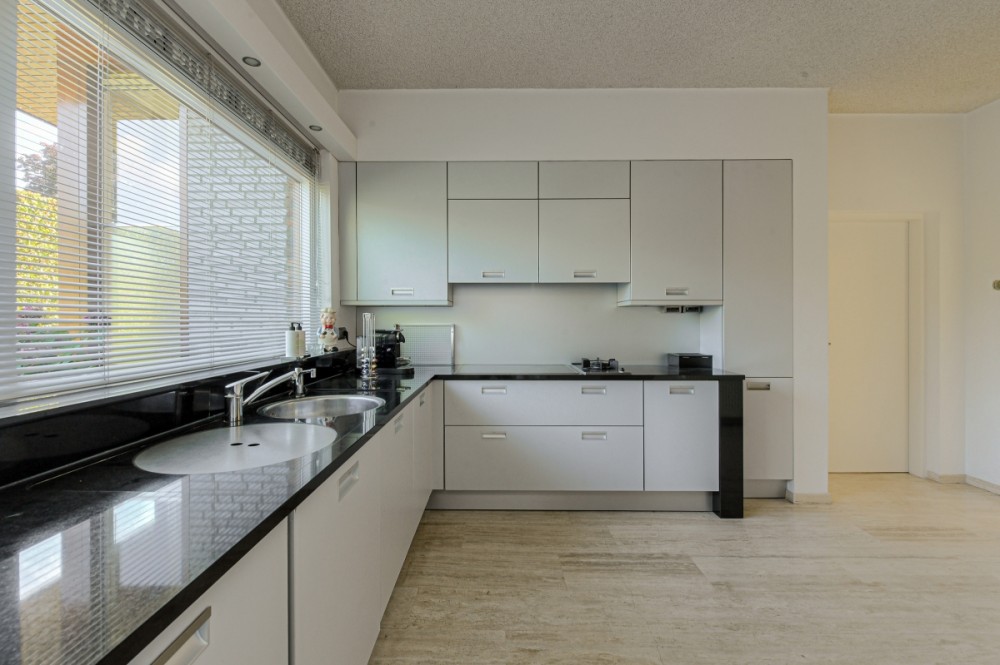 De royaal opgezette keuken is voorzien van een modern keukenblok in hoekopstelling, alle benodigde inbouwapparatuur. Aangrenzend bevindt zich de praktische bijkeuken met aansluiting t.b.v. de wasapparatuur.