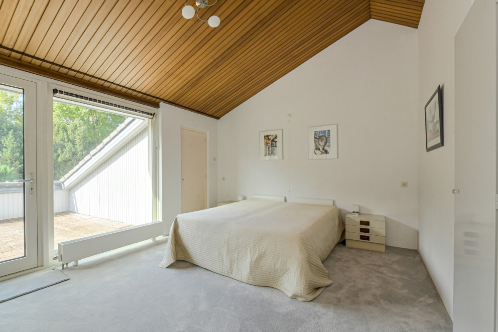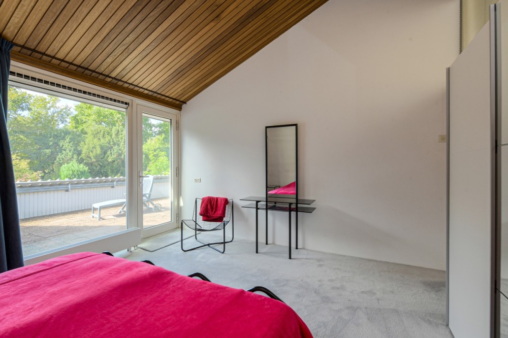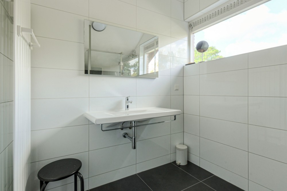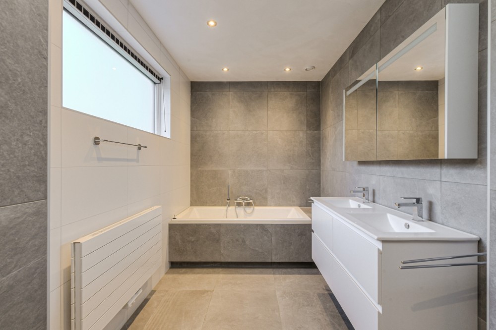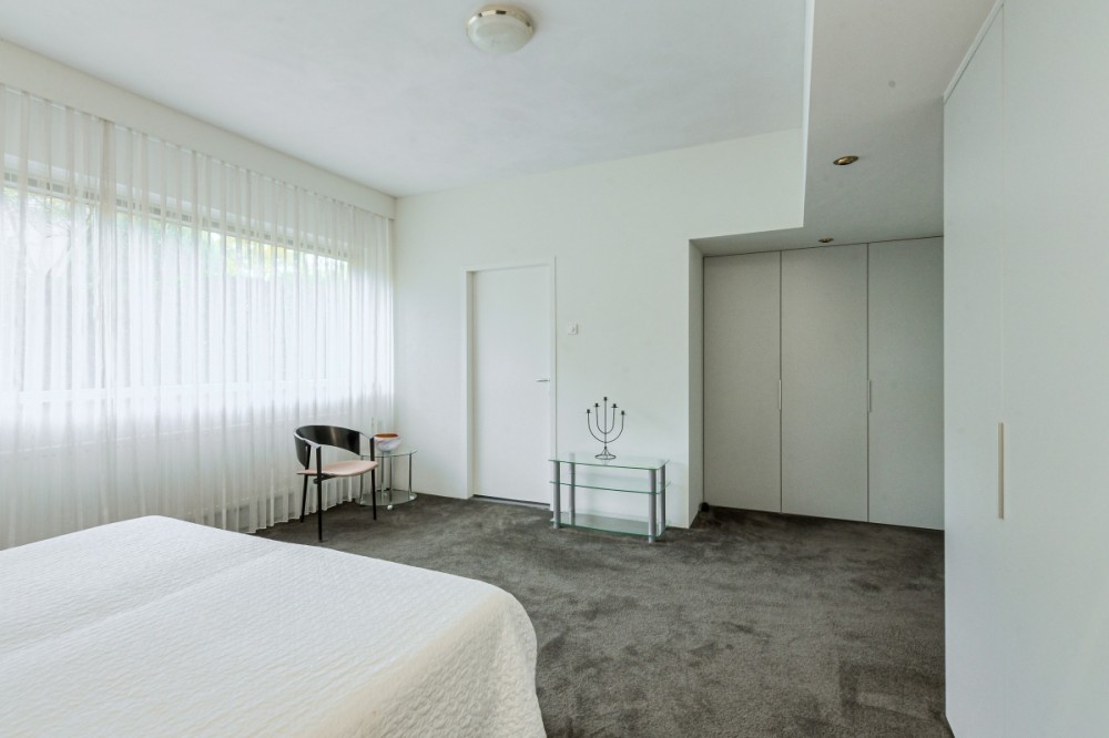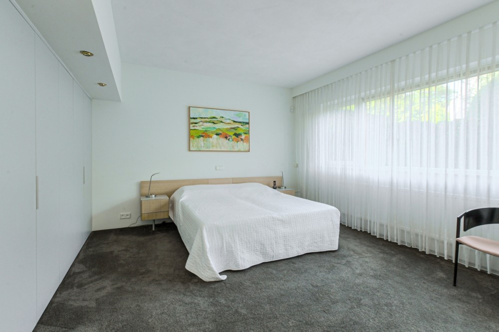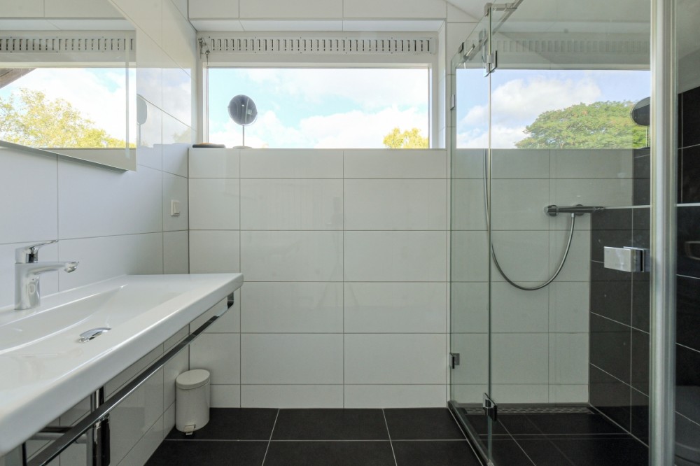 De ouderslaapkamer (ca. 23m²) op de begane grond is bereikbaar vanuit de living en beschikt over een zeer ruime kastenwand en een doorloop naar de gerenoveerde badkamer, voorzien van een ligbad, inloopdouche met glazen deur, dubbele wastafel met meubel en zwevend toilet.