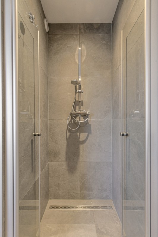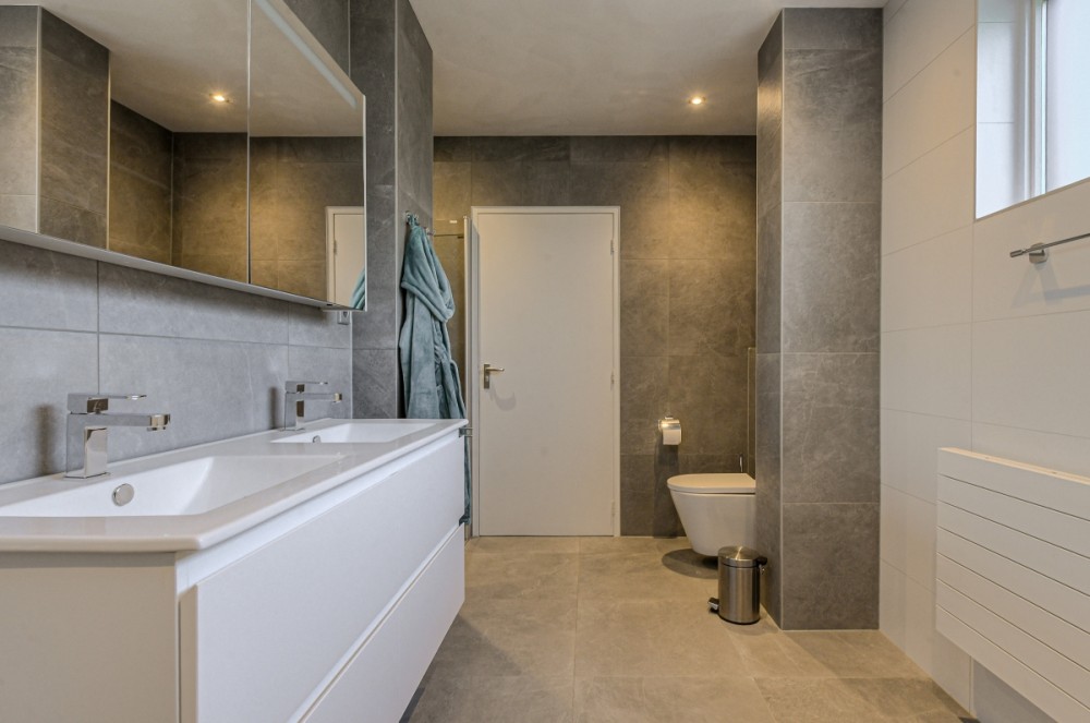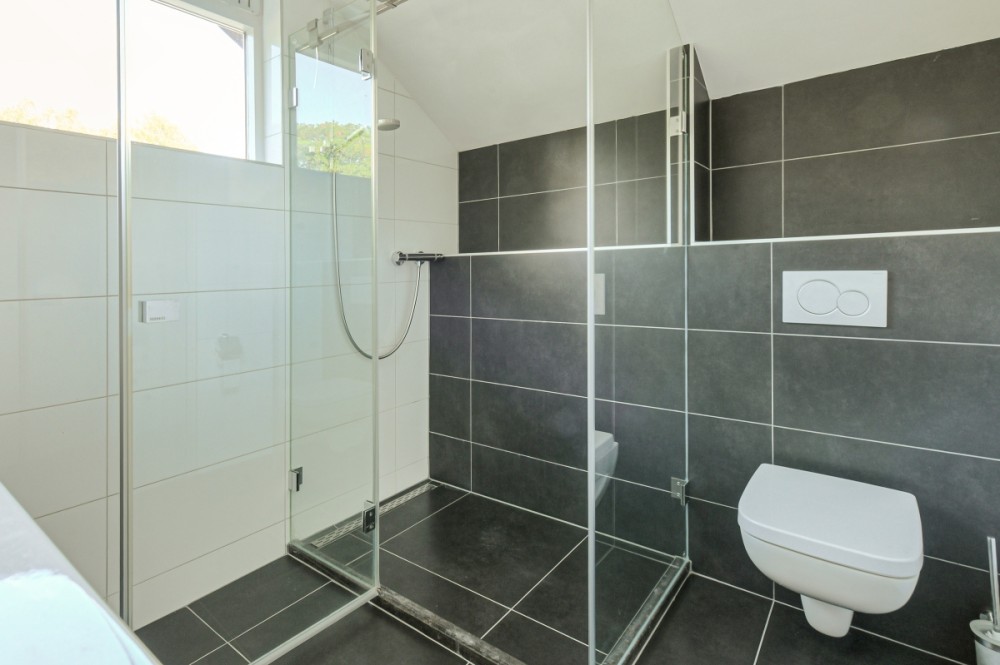 Betegelde badkamer met vloerverwarming en voorzien van een zeer ruime inloopdouche met glazen wandpaneel en deur, vaste wastefel met spiegel en zwevend toilet.