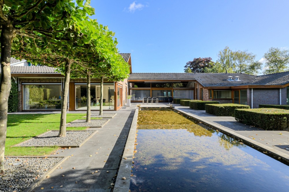 De bijzonder sfeervolle tuin is gelegen op het zuid/westen is geheel onder fraaie architectuur aangelegd en biedt veel privacy. De mooie strakke belijning met diverse terrassen en vijverpartij is doorgetrokken in de gehele tuin.