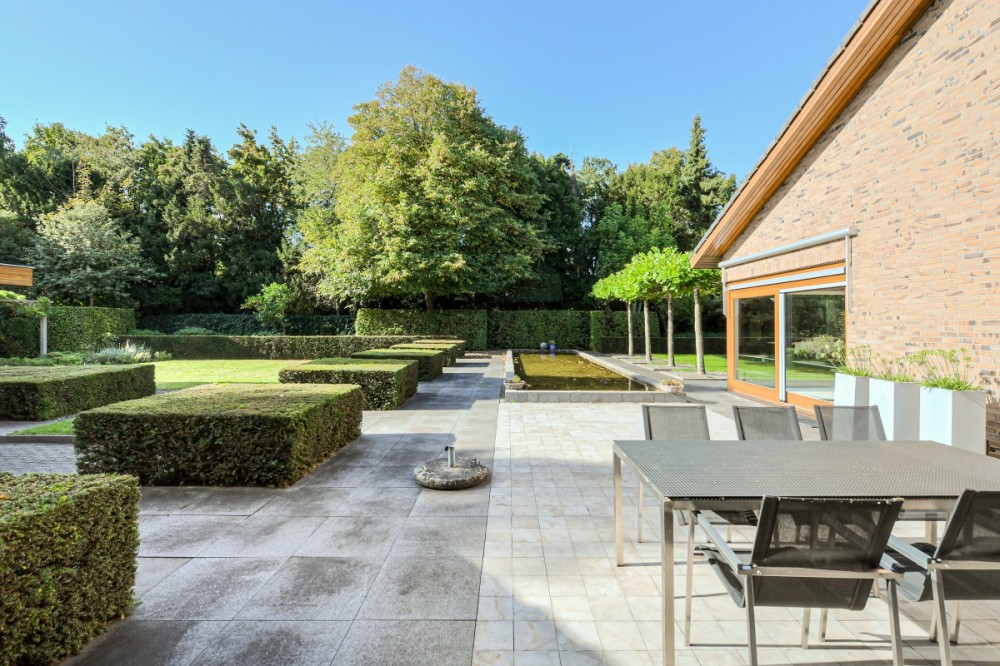 -Onder architectuur aangelegde tuin met strakke zichtlijnen;