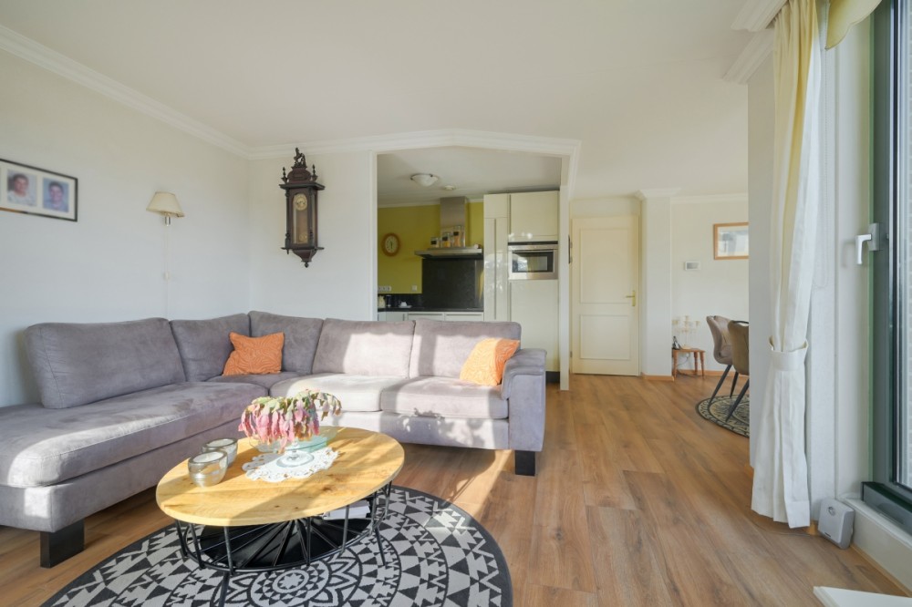 Royale living van ca. 29 m² met open keuken. De woonkamer is voorzien van een houtenvloer, spachtelputzwanden en schuifpui met toegang tot het dakterras.