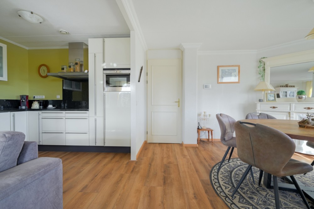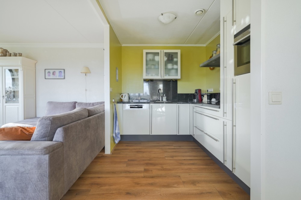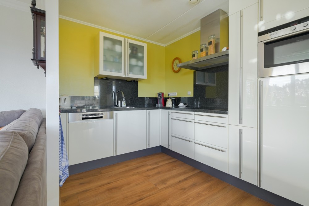 De open keuken is eveneens voorzien van een houtenvloer. De hoekkeukenopstelling is voorzien van keukenkasten en diverse inbouwapparatuur, te weten: inductiekookplaat, RVS afzuigkap, koelkast, vaatwasmachine en combi oven/magnetron.