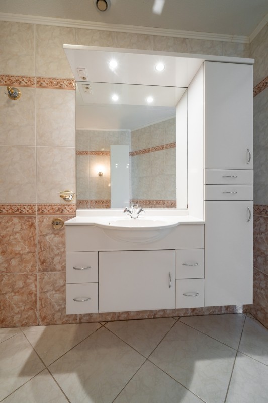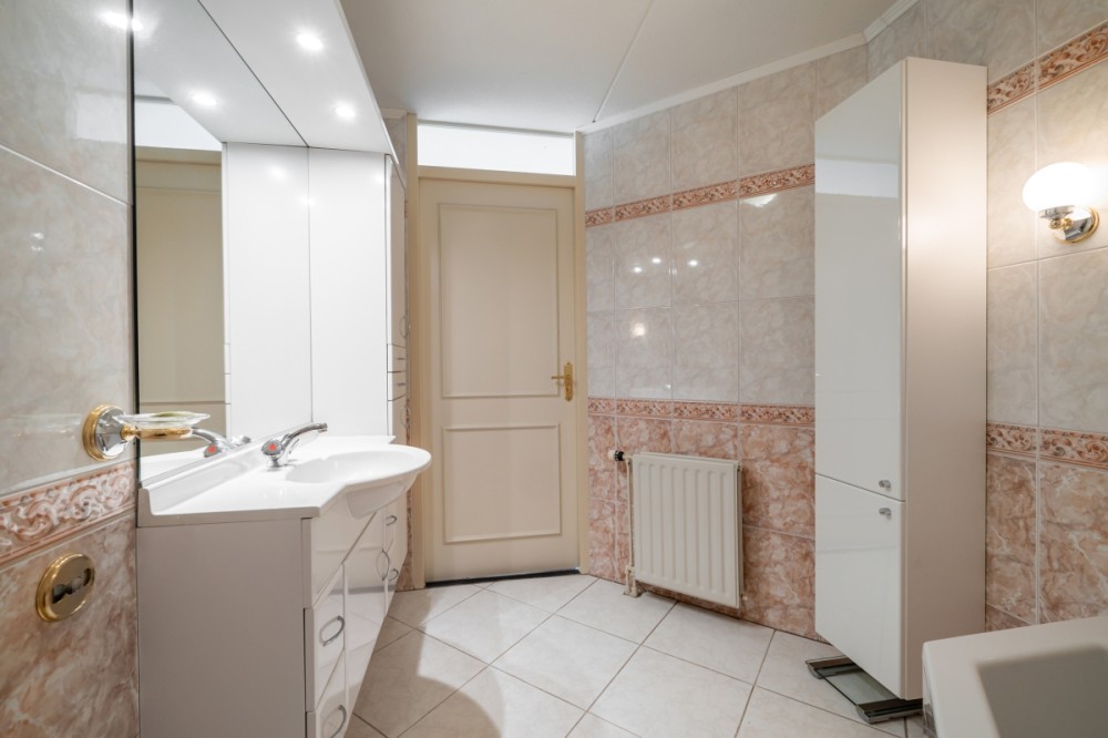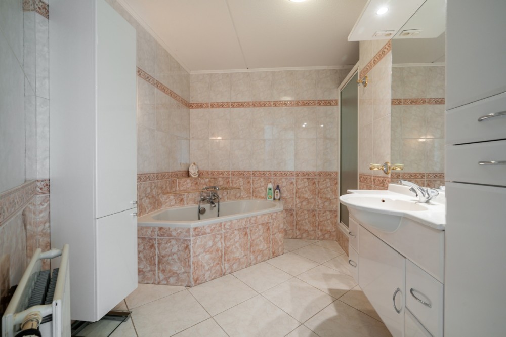 Tot plafond betegelde badkamer met douche, ligbad en wastafel met meubel. Separate toiletruimte welke eveneens tot het plafond betegeld is met fonteinje.