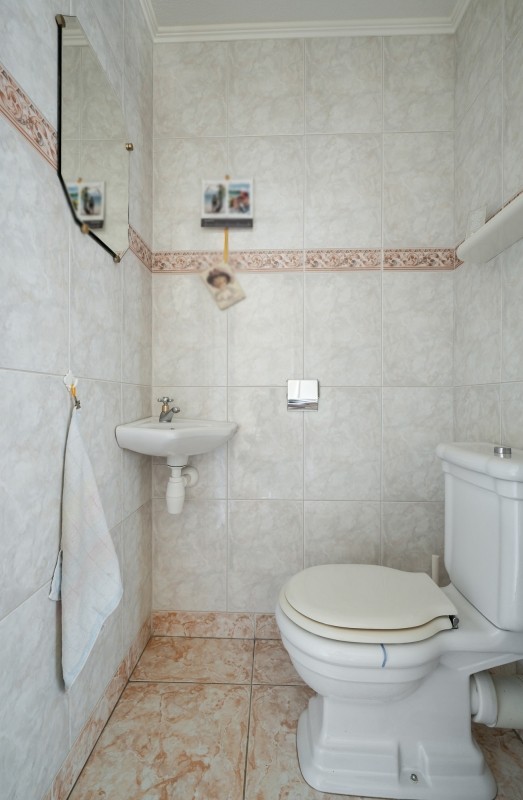Entree, ruime hal met meterkast en toegang tot alle vertrekken. Separaat tot plafond betegeld wandcloset met fontein.