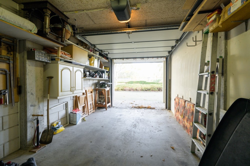 Bij de woning behoort een eigen inpandig te bereiken garage en berging. Tevens zijn er een gezamenlijke fietsenberging, een parkeerplaats aan de achterzijde van het complex