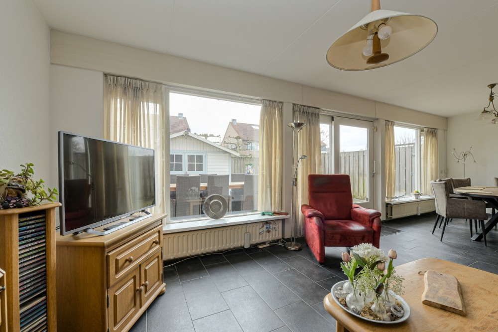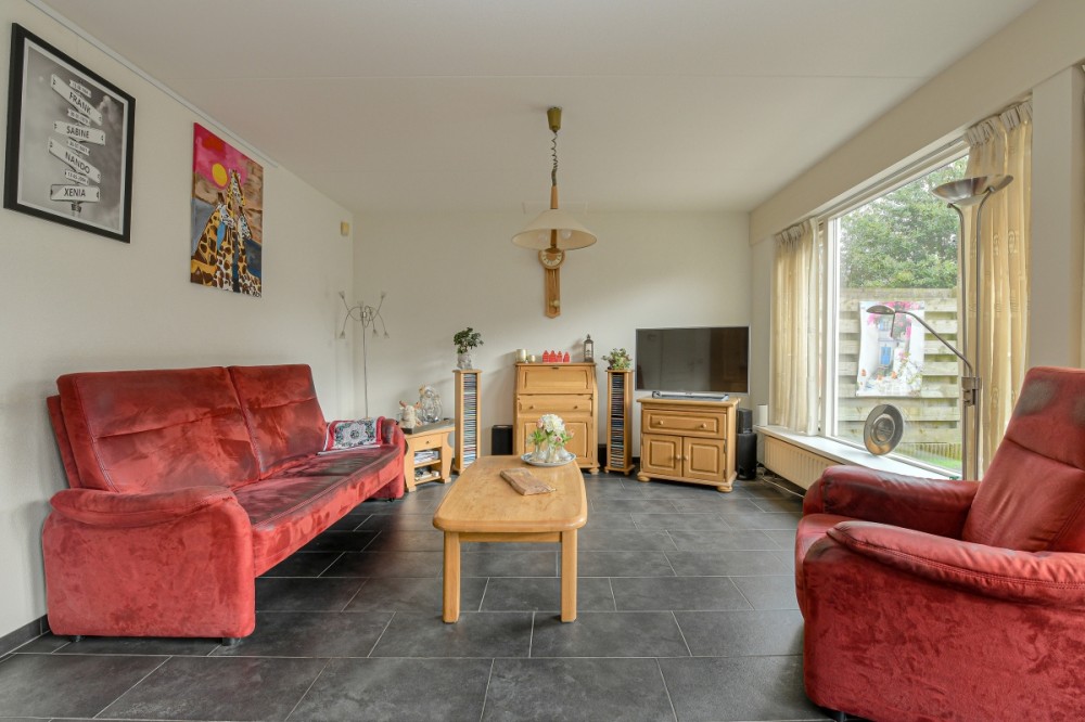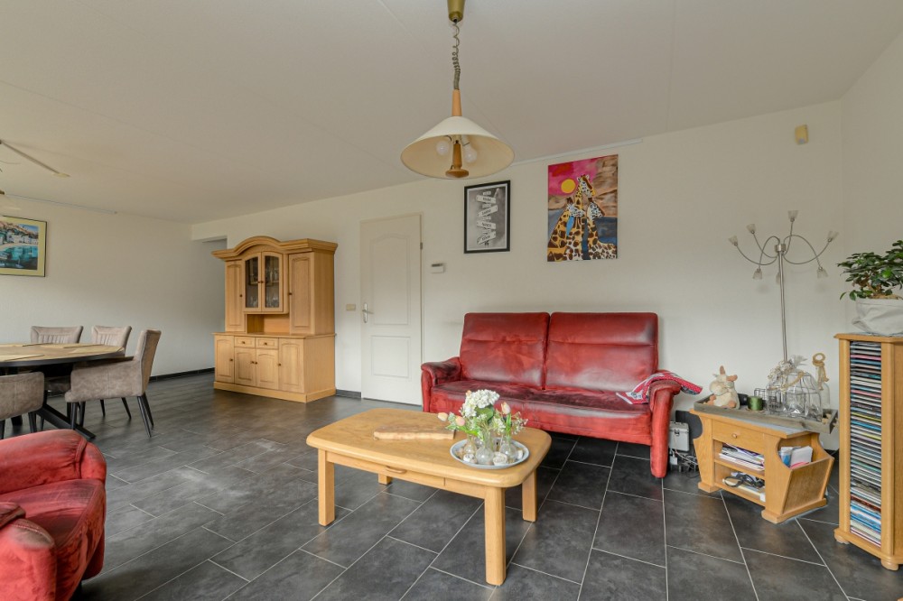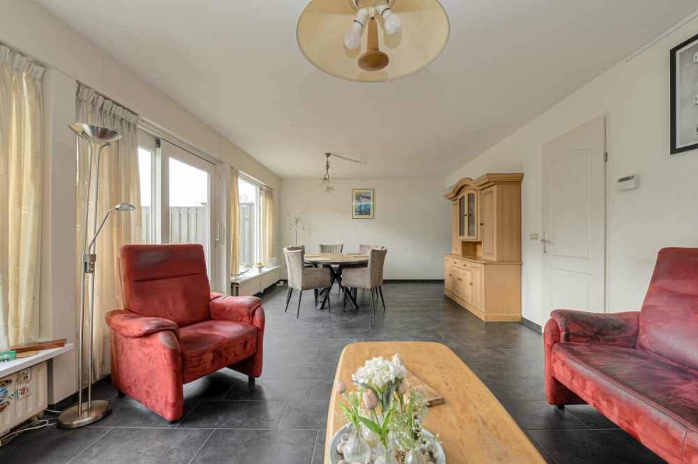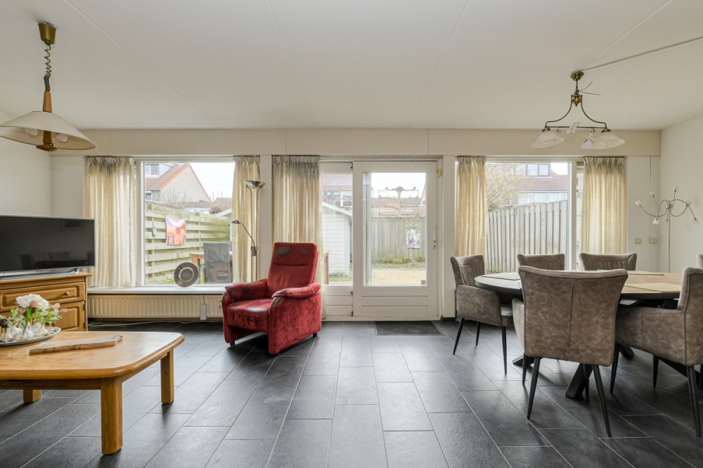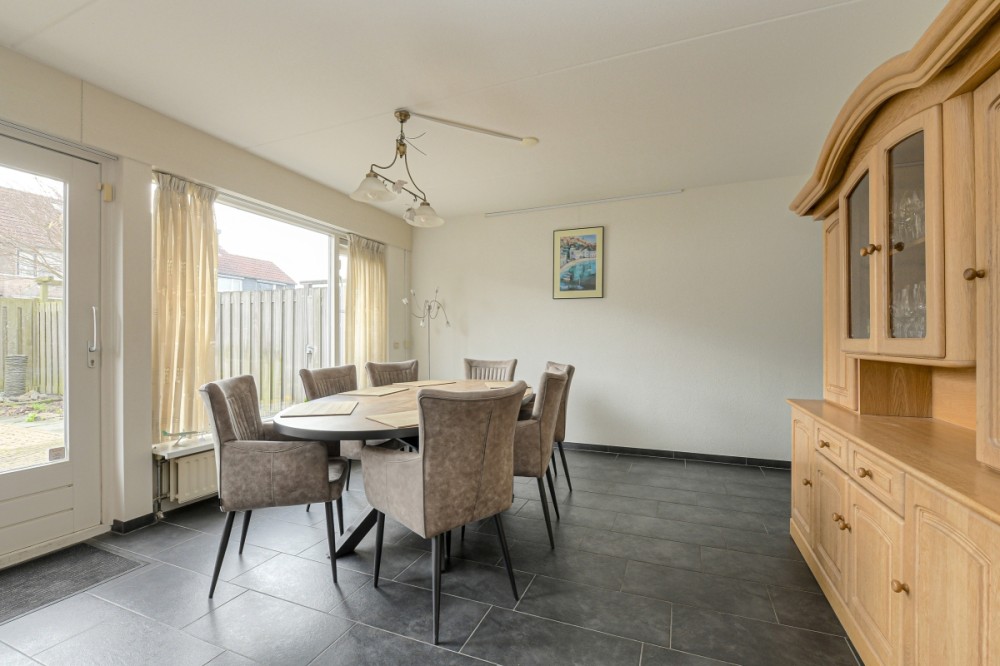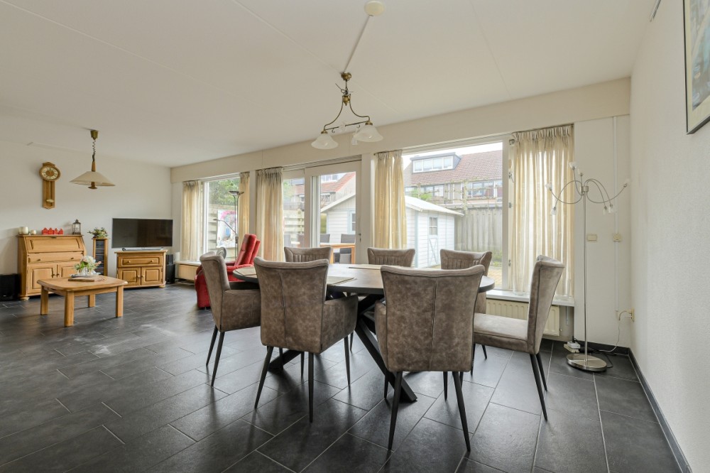 Riante tuingerichte woon/eetkamer afm. ca. 4.00 x 8.05m met plavuizenvloer en grote schuifpui naar de tuin/terras. Deze woonkamer biedt voldoende ruimte voor het plaatsen van een gezellige zithoek en een grote eetkamertafel.