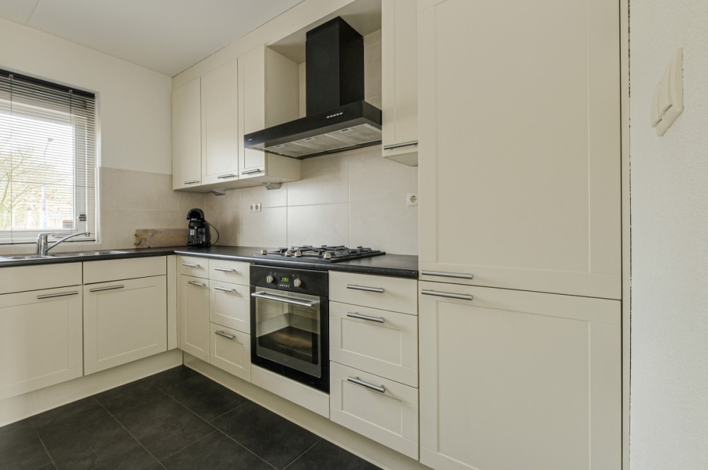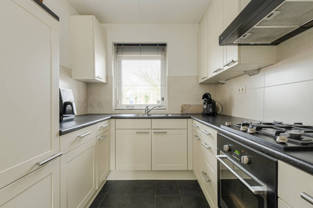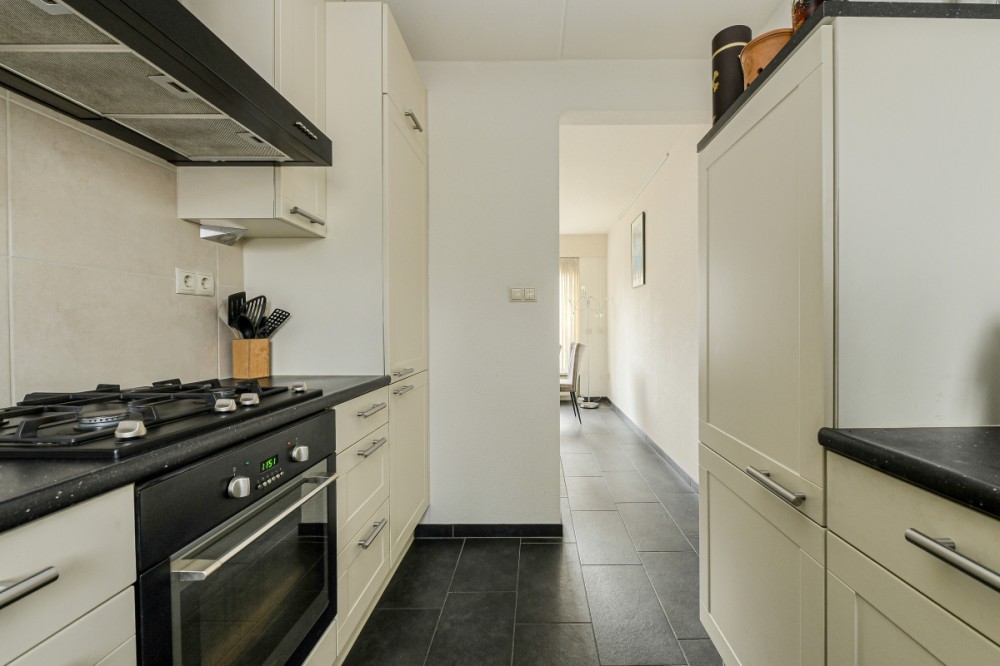 Aan de voorzijde gelegen open keuken welke eveneens is voorzien van een plavuizenvloer en een witte U-keukenopstelling met diverse boven- en onderkasten. Voorts diverse inbouwapparatuur, te weten; gaskookplaat, afzuigkap, vaatwasser, koelkast en vriezer.