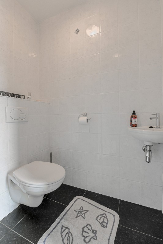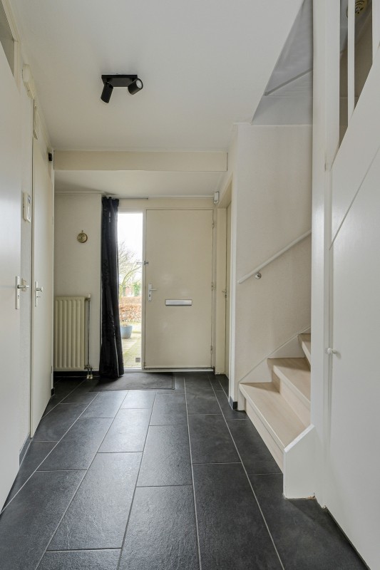 Entree/ hal met trapopgang naar de eerste verdieping, meterkast, betegelde toiletruimte v.v. hangcloset en fonteintje. Vanuit de hal is tevens de ruime inpandig garage bereikbaar.
