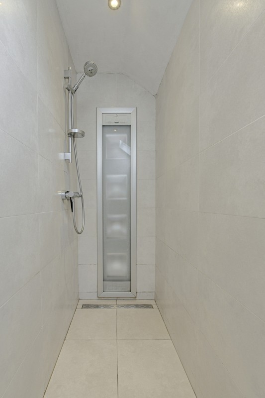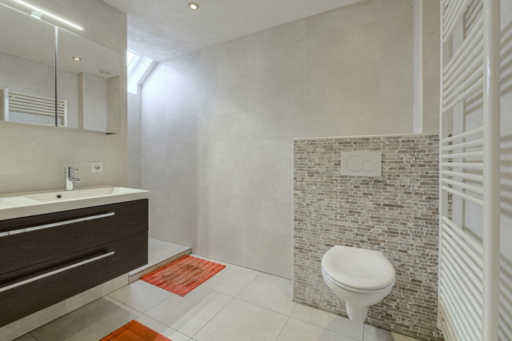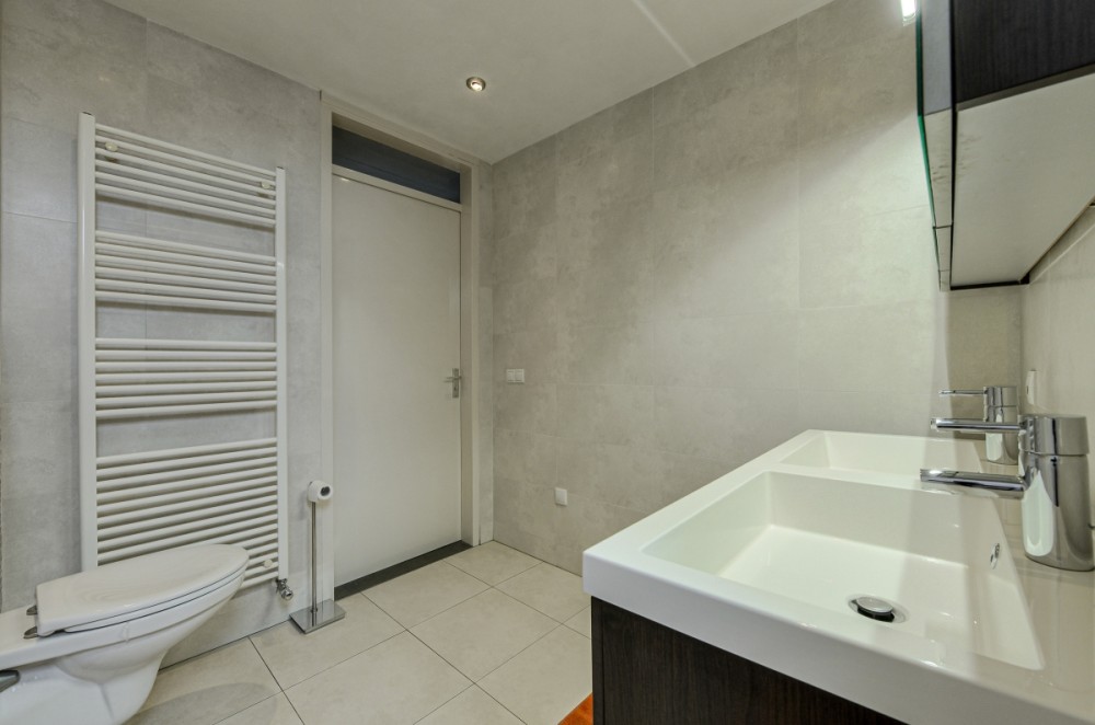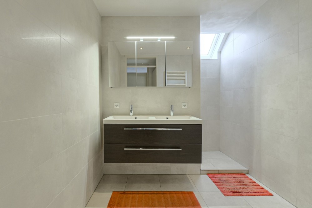 De gemoderniseerde badkamer, afm. ca. 3.25 x 2.35 m., uitgerust met inloopdouche, dubbele wastafel met meubel en spiegelkast, hangend toilet, designradiator en kunststof Velux raam.