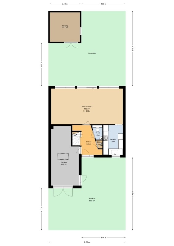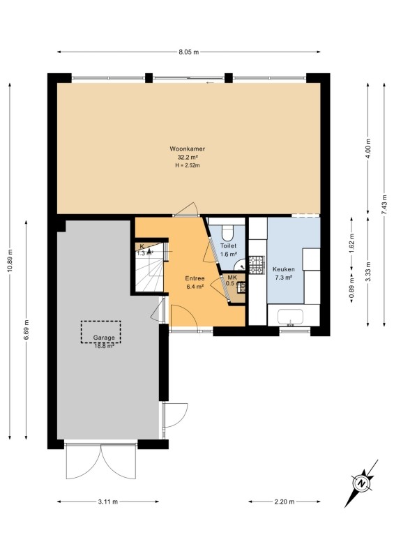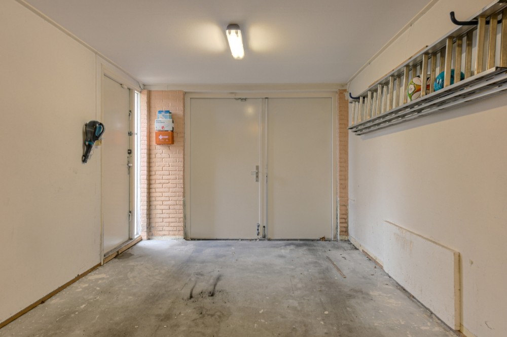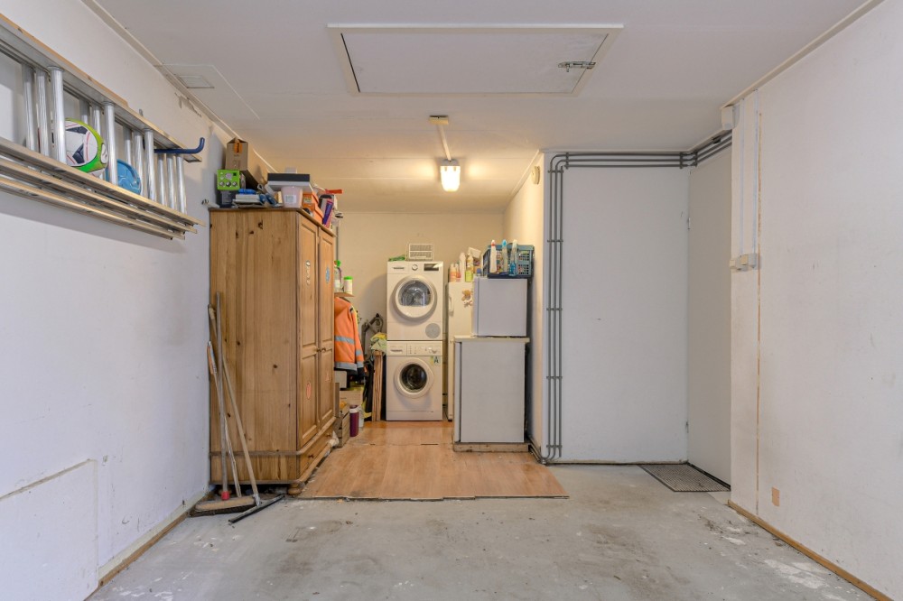 Aan de voorzijde van de woning is de garage bereikbaar. Deze is zowel van binnenuit als buiten bereikbaar en voorzien van garagedeuren, verwarming en aansluitingen t.b.v. de wasapparatuur. Tevens is de garage voorzien van een praktische bergzolder.