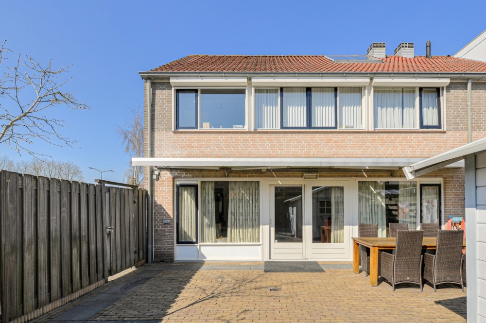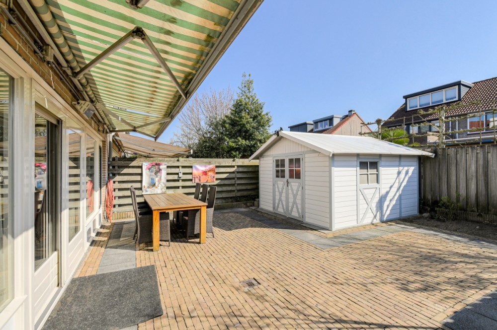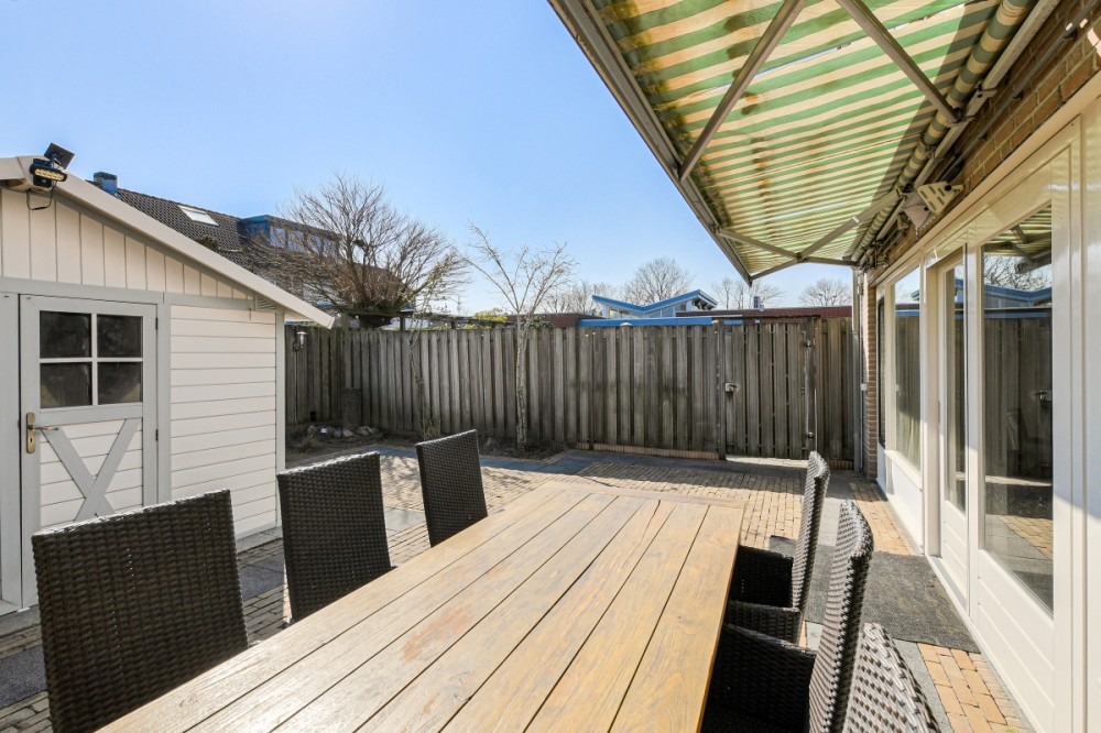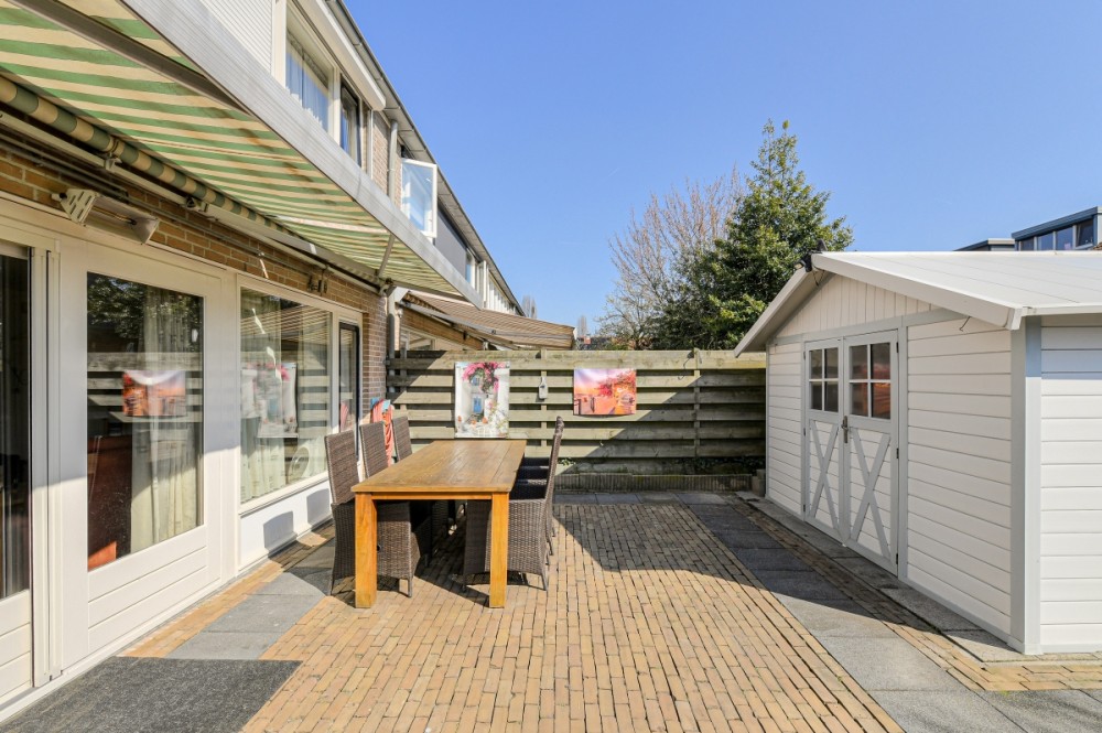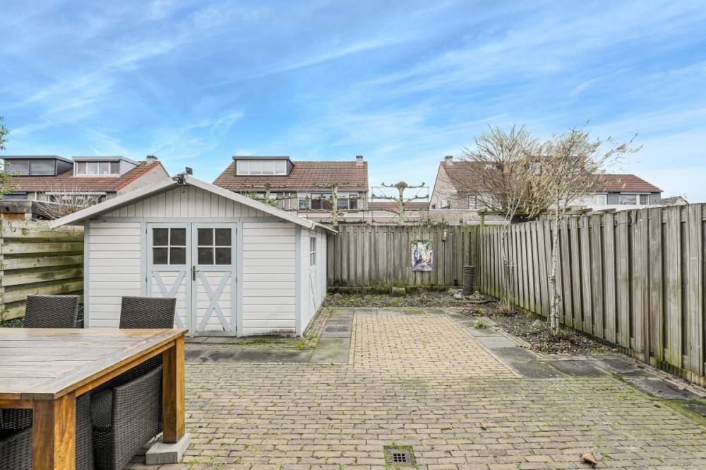 De omsloten achtertuin is gelegen op het zuiden met sierbestrating en kunststof berging voorzien van electra. Achter tegen de woning bevindt zich een groot zonnescherm.